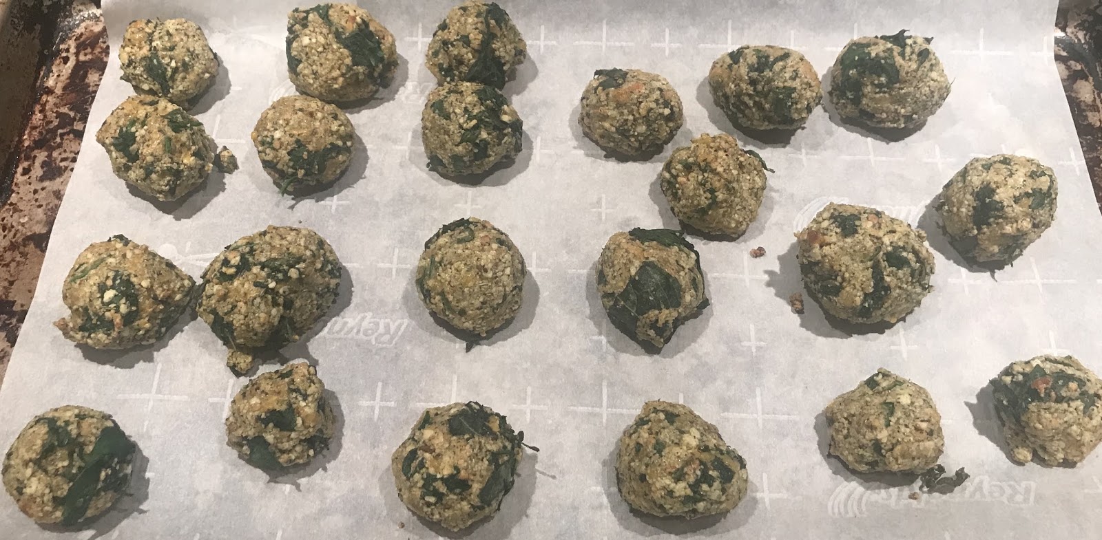 I needed to have something healthy on this menu, and these spinach balls fit the bill. They’re made with fresh spinach, cheddar cheese, Gluten free panko crumbs, and eggs. But more importantly than being healthy, they have to be delicious – and they are! Makes roughly 24 spinach balls.