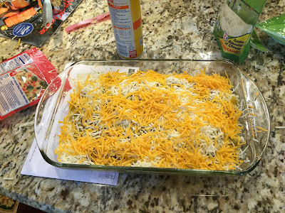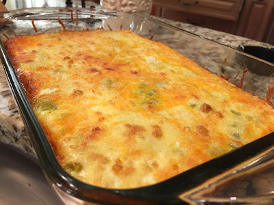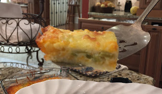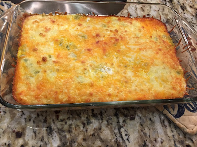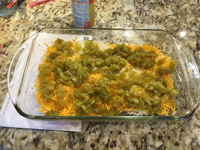 Layer cheeses and chilies in a greased 8-in. square (or equivalent) baking dish, starting and ending with cheeses. Press down slightly all over.
