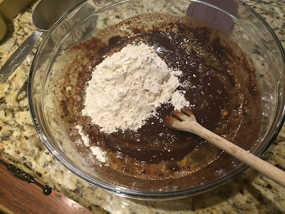 Stir in sugar. Add eggs, vanilla, and cocoa and stir well.
