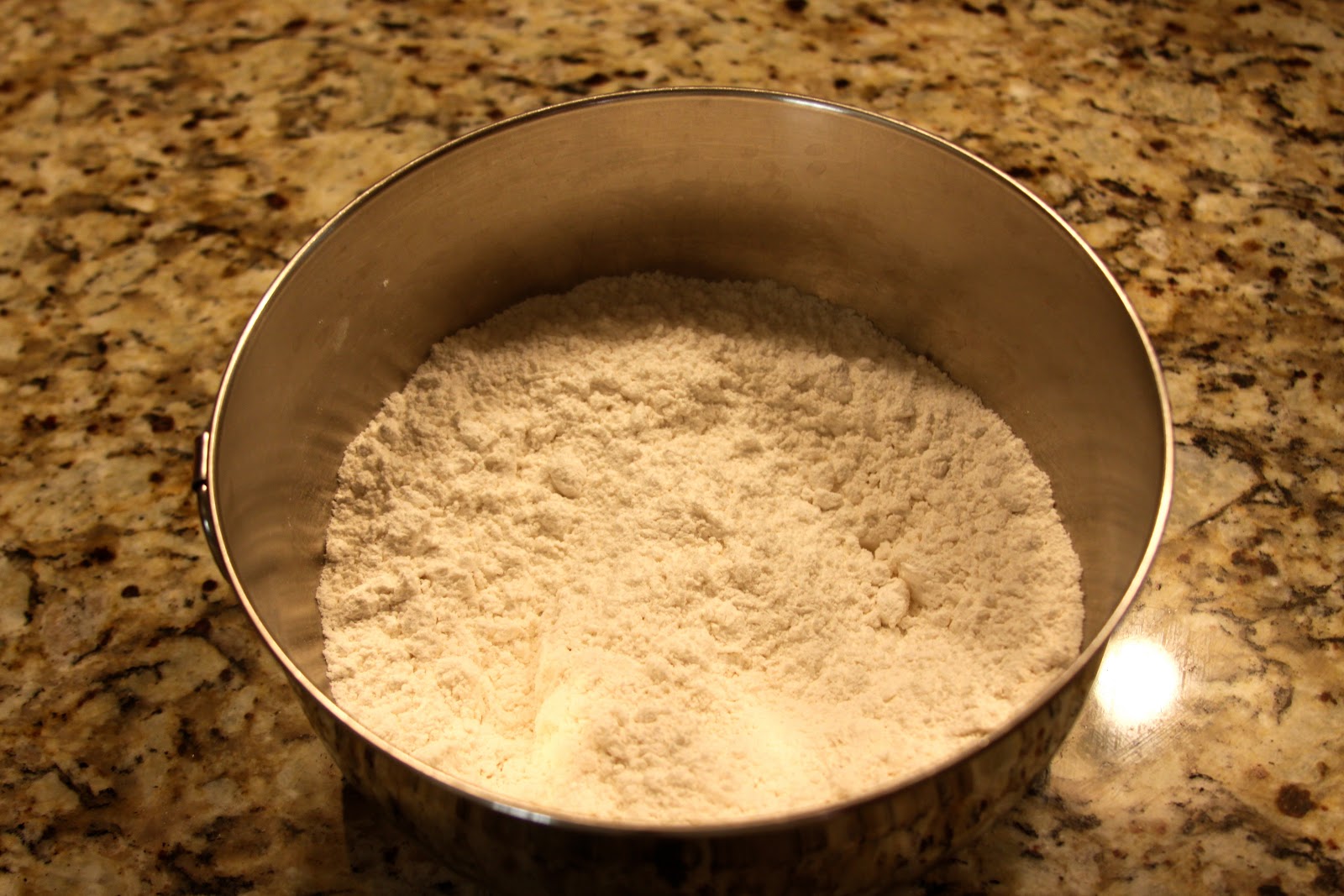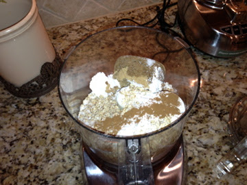 Put the flour, brown sugar, oats, salt, baking powder, baking soda, and cinnamon in a food processor.