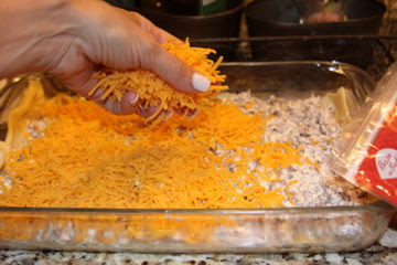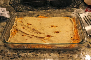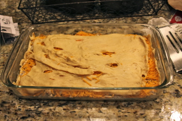 Unroll second can of dough on work surface. Press to form 13×9-inch rectangle; firmly press perforations to seal. Carefully place over cheese. ***NOTE: this part was VERY frustrating! I was unable to lift the rectangle without destroying it, so I did the best I could to place it on top of the cheese.