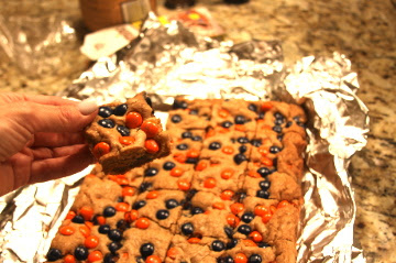 and turn the batter into the prepared pan, smoothing the top with the spatula. Sprinkle remaining M&Ms on top and press in slightly.