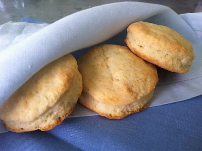 Using a metal spatula if necessary, move the biscuits to an ungreased baking sheet, placing the biscuits 1 inch apart. Refrigerate the biscuits for 10 to 20 minutes until cold. Bake the biscuits on the top rack of the oven for a total of 10 to 12 minutes until light golden brown. After 6 minutes, rotate the pan in the oven so that the front of the pan is now turned to the back, and check to see if the bottoms are browning too quickly. If so, slide another packing pan underneath to add insulation and retard the browning. Continue baking another 4 to 6 minutes until the biscuits are light golden brown. When the biscuits are done, lightly brush the tops with butter. Turn the biscuits out upside down on a plate to cool slightly. Serve hot, right side up.