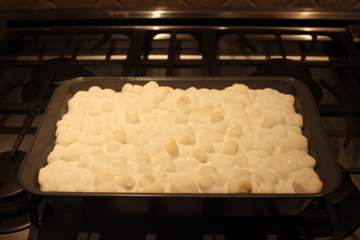 Preheat oven to 350 degrees F. Mix butter and sugar. Add eggs and mix well. Sift dry ingredients (cocoa, flour and salt), and add to the butter mixture, then add vanilla (and nuts if desired). Pour batter into a greased and floured 9×13 baking pan. Bake about 25-30 minutes (until a wooden pick comes out clean) and then pour mini marshmallows on top. (Make the frosting while the cake is baking.) Return to the oven and bake an additional 5-10 minutes – just until lightly browned. Remove from oven and frost.