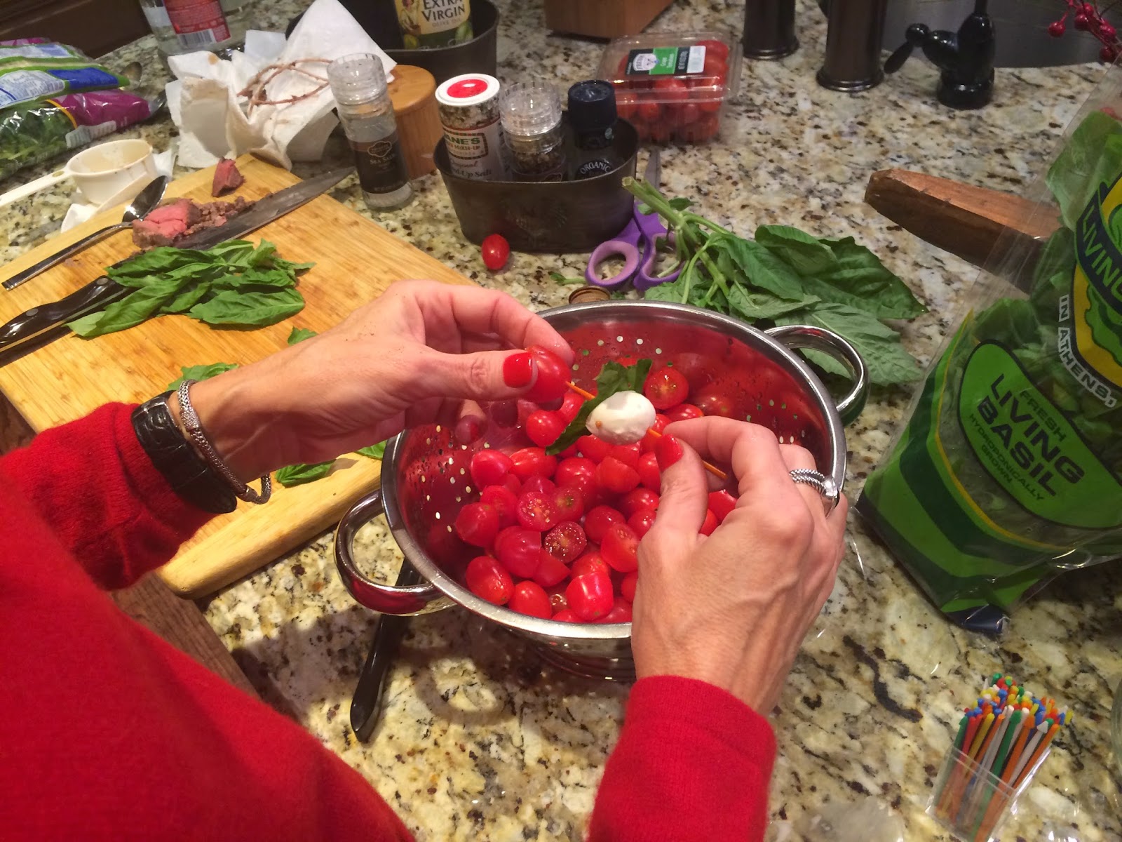 Cut tomatoes in half. Thread a mini mozzarella cheese ball, basil leaf and a tomato half onto a tooth pick. Repeat with remaining ingredients.