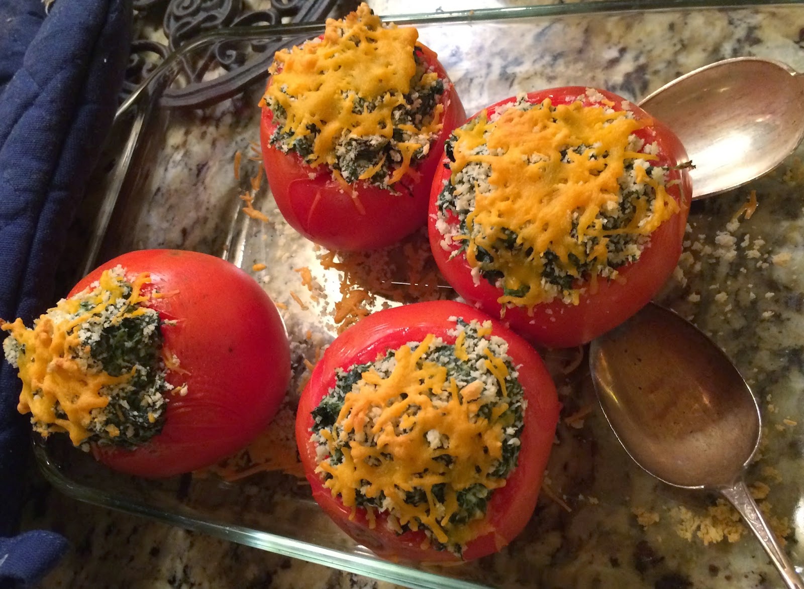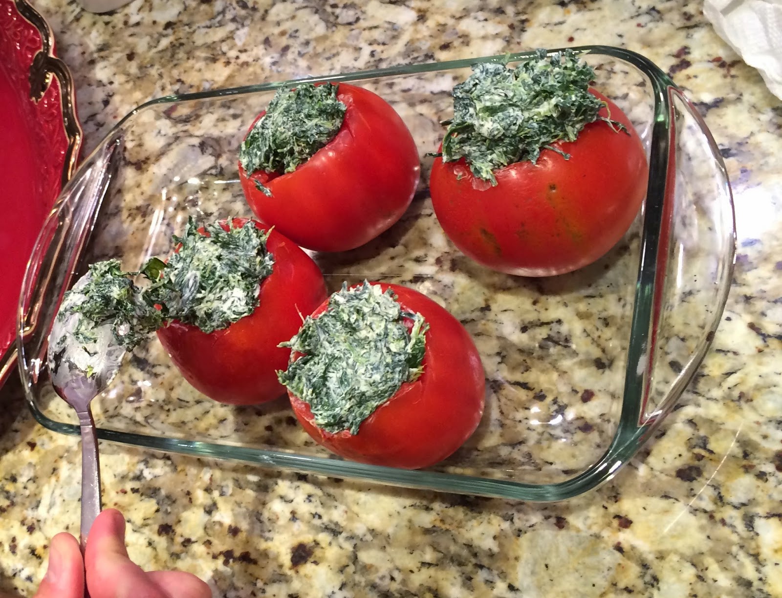 Thaw the spinach and squeeze out excess moisture. Mix the spinach with the softened cream cheese and chives and garlic salt and pepper (can add a bit of milk to the mixture if it’s too stiff). Stuff the tomatoes with the spinach mixture, and top each with panko crumbs and then with the cheese.