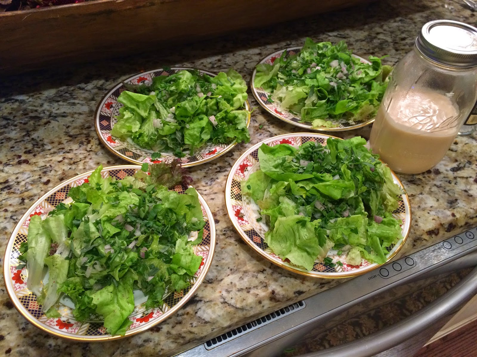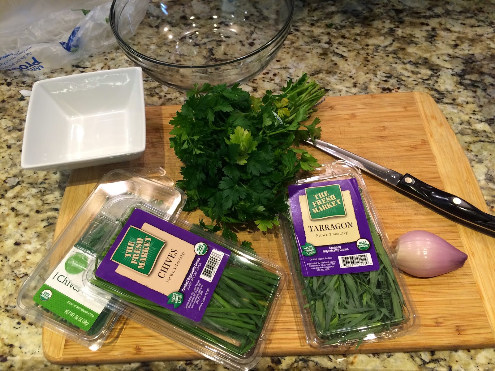 Mix the house vinaigrette with the lemon juice. Plate the lettuce on individual plates. Sprinkle with a pinch of salt, a few grinds of pepper, 1 1/2 teaspoons of the shallots and chives, and 1 tablespoon each of the parsley, tarragon, and chervil on each. Then drizzle with 2 tablespoons of the vinaigrette/lemon mix.