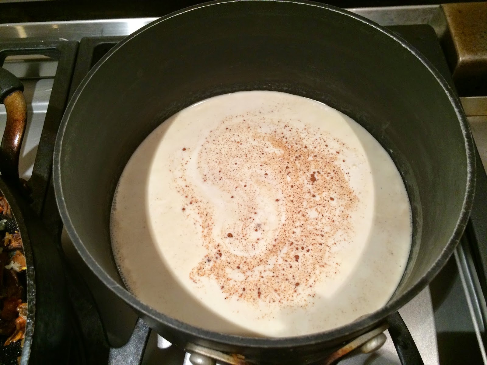Bring the cream, milk, reserved mushroom water and nutmeg to a simmer and remove from heat.