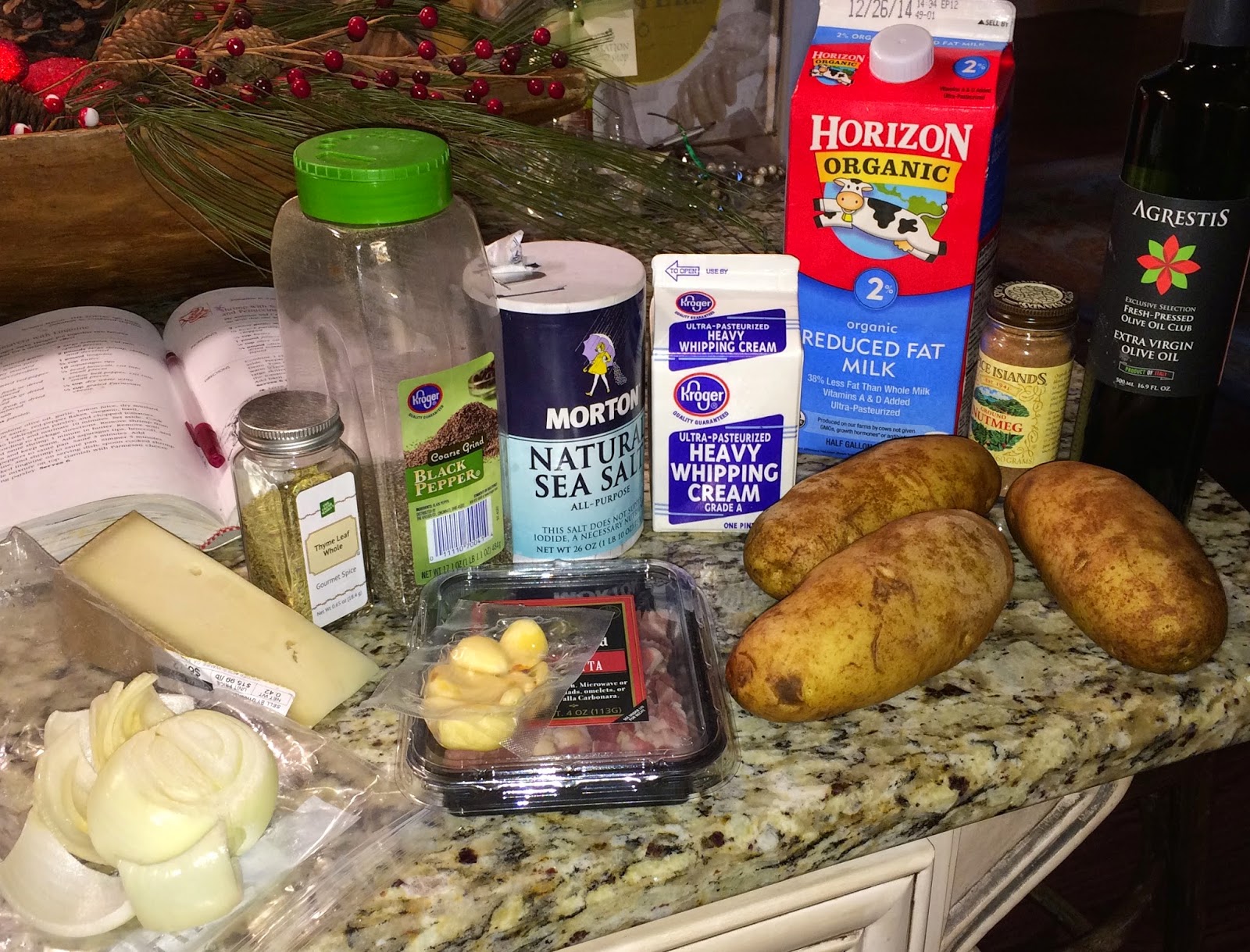 Pour a bit of the cream over the bottom of an 8x8x2 inch baking pan and layer 1/2 of the sliced potatoes on top followed by half of the pancetta and mushroom mixture and cheese.
