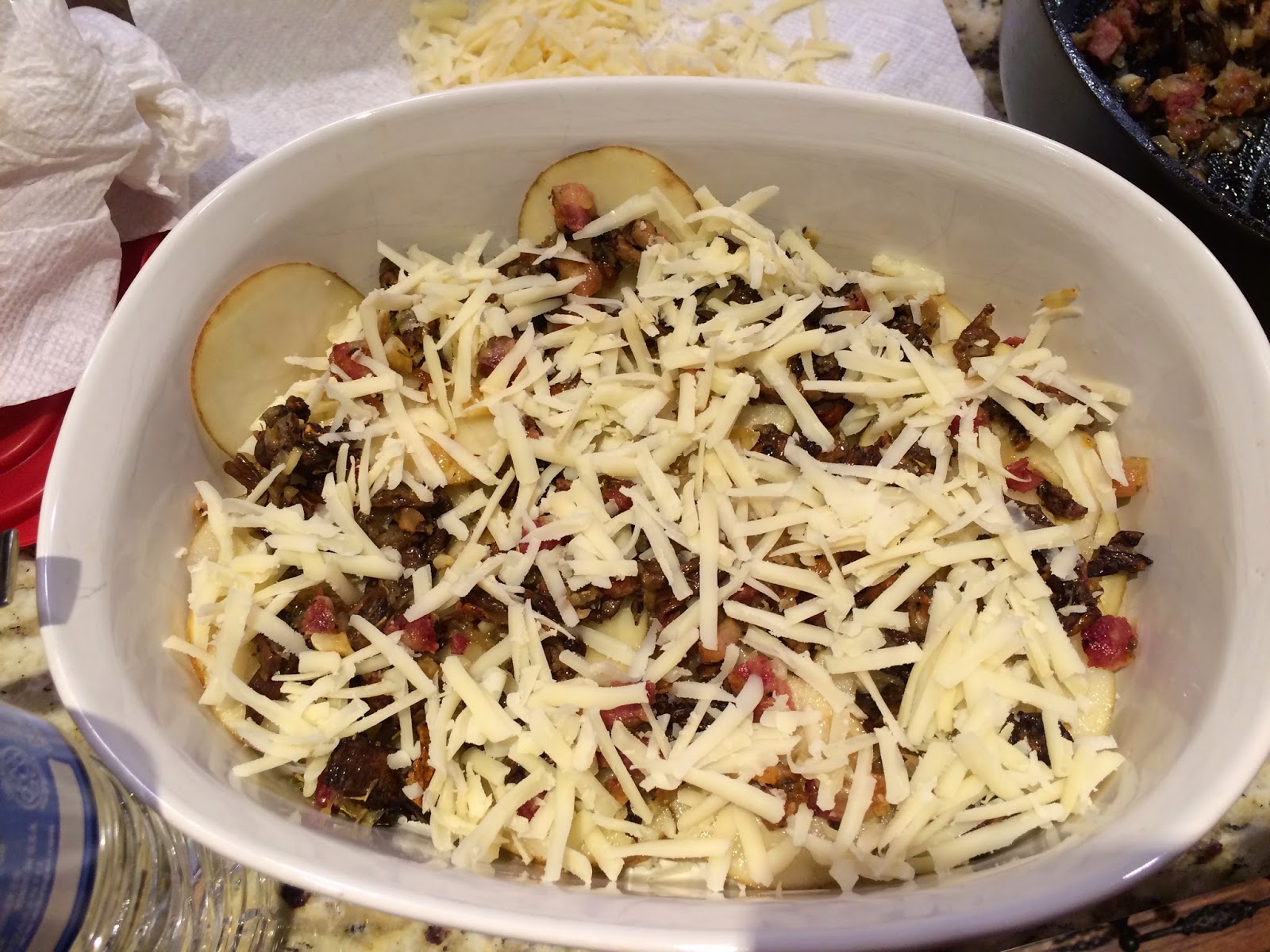 Followed with the remaining potatoes, the cream and the remaining pancetta and mushroom mixture and cheese and cover in foil.