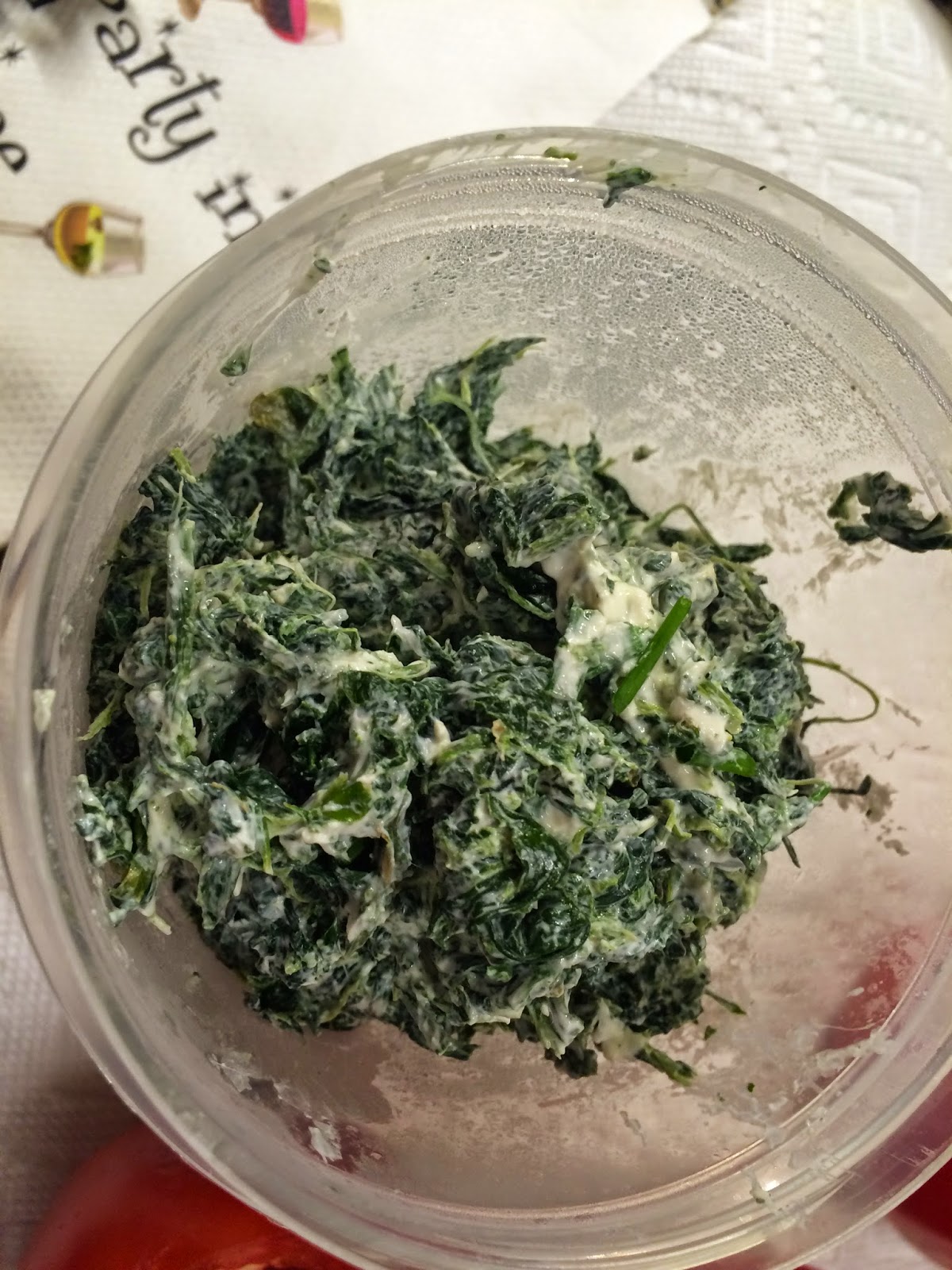 Thaw the spinach and squeeze out excess moisture. Mix the spinach with the softened cream cheese and chives and garlic salt and pepper (can add a bit of milk to the mixture if it’s too stiff). Stuff the tomatoes with the spinach mixture, and top each with panko crumbs and then with the cheese.