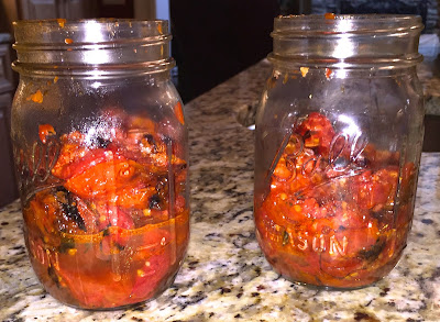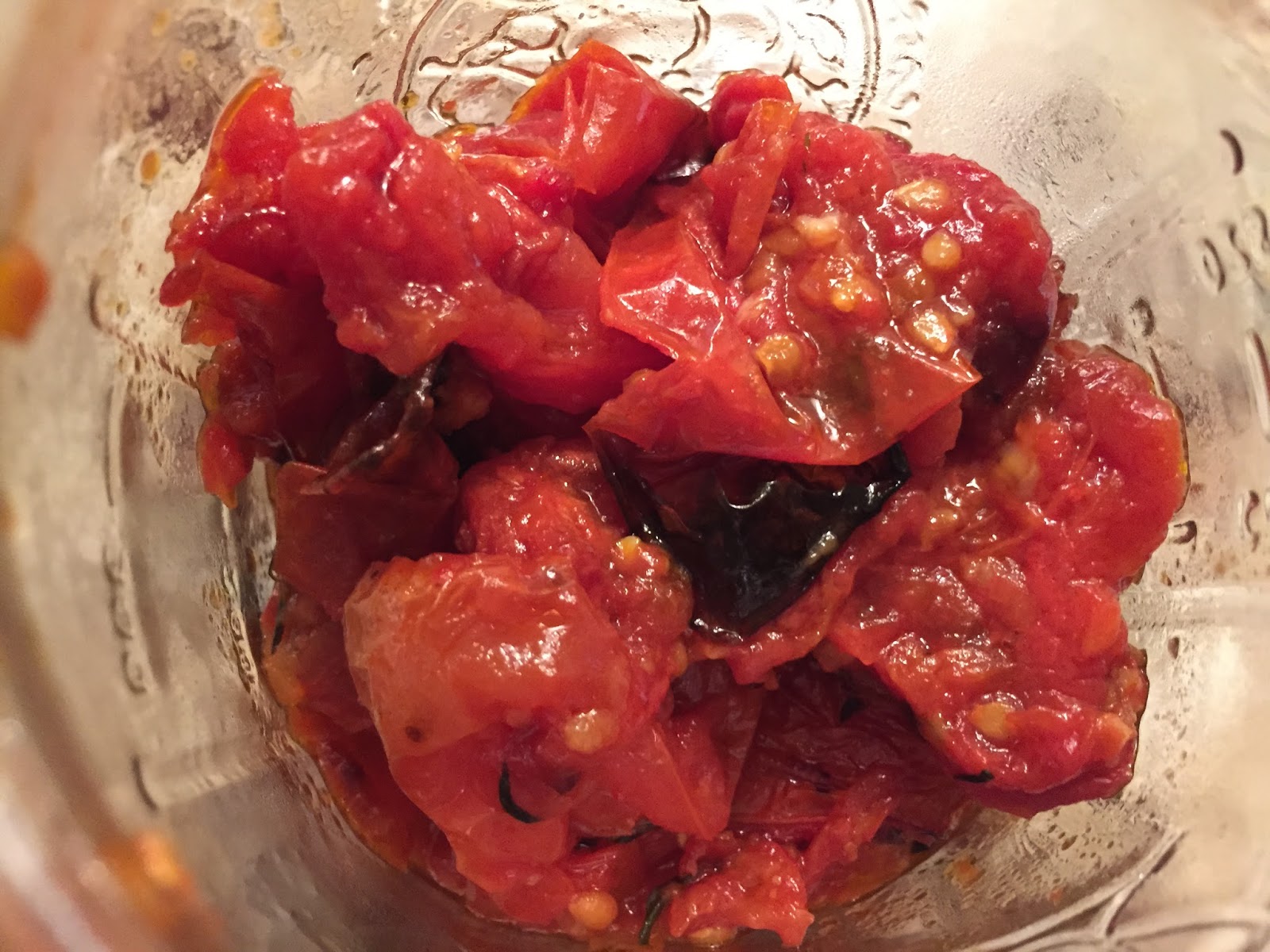 Bake for about 3 hours, stirring occasionally, until the tomatoes are deeply caramelized. Then turn the heat up to 450 degrees F and roast another hour. Discard the thyme and garlic and let cool. Mash a bit. Store in mason jars.