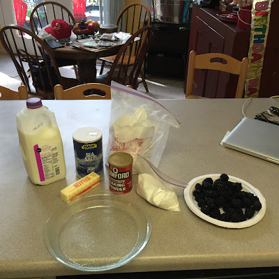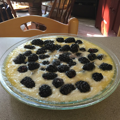 Whisk in the milk and melted butter, stirring until just incorporated. Butter a pie plate or similar sized baking dish. Pour the batter into the buttered dish, and then sprinkle the blackberries over the top.