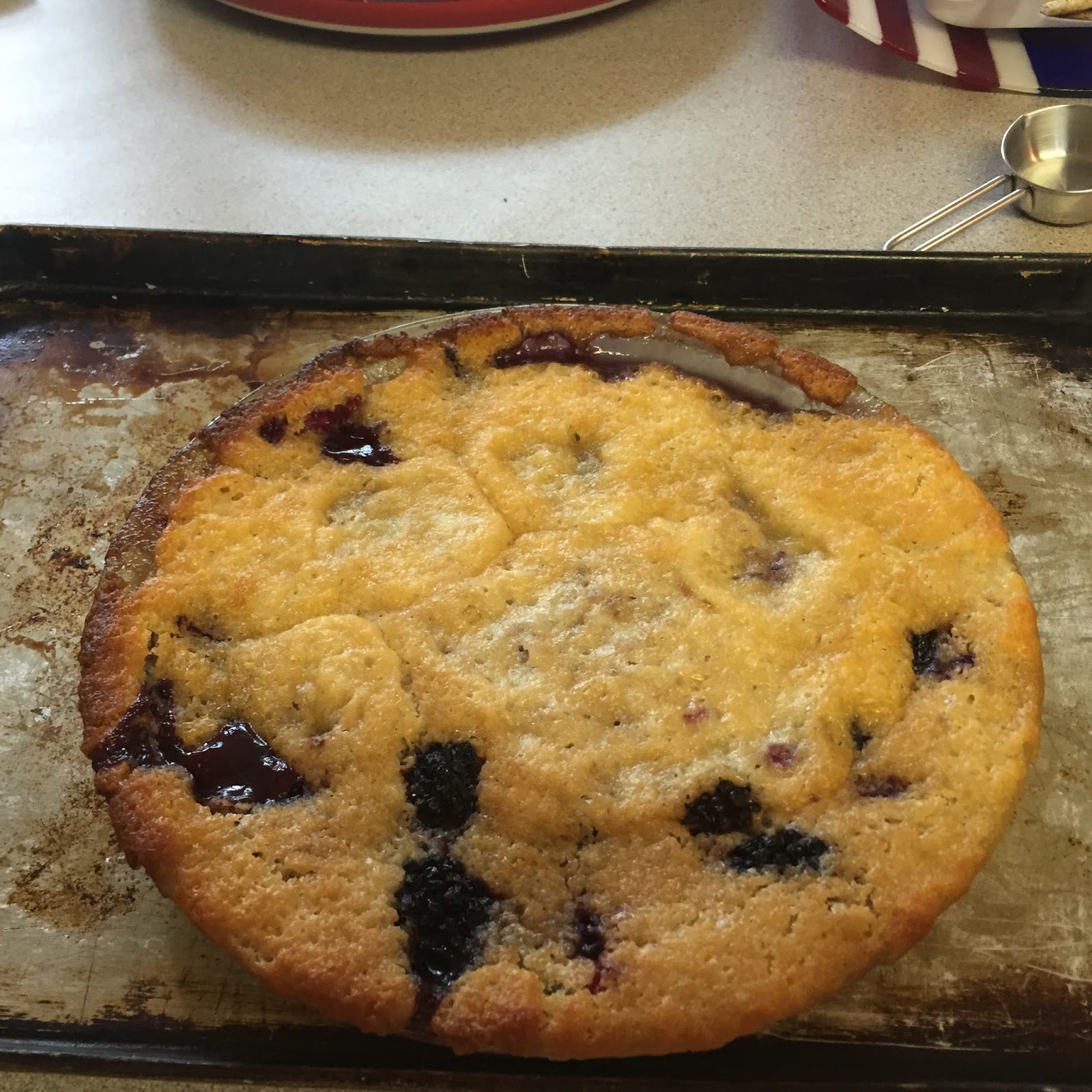 Whisk in the milk and melted butter, stirring until just incorporated. Butter a pie plate or similar sized baking dish. Pour the batter into the buttered dish, and then sprinkle the blackberries over the top.