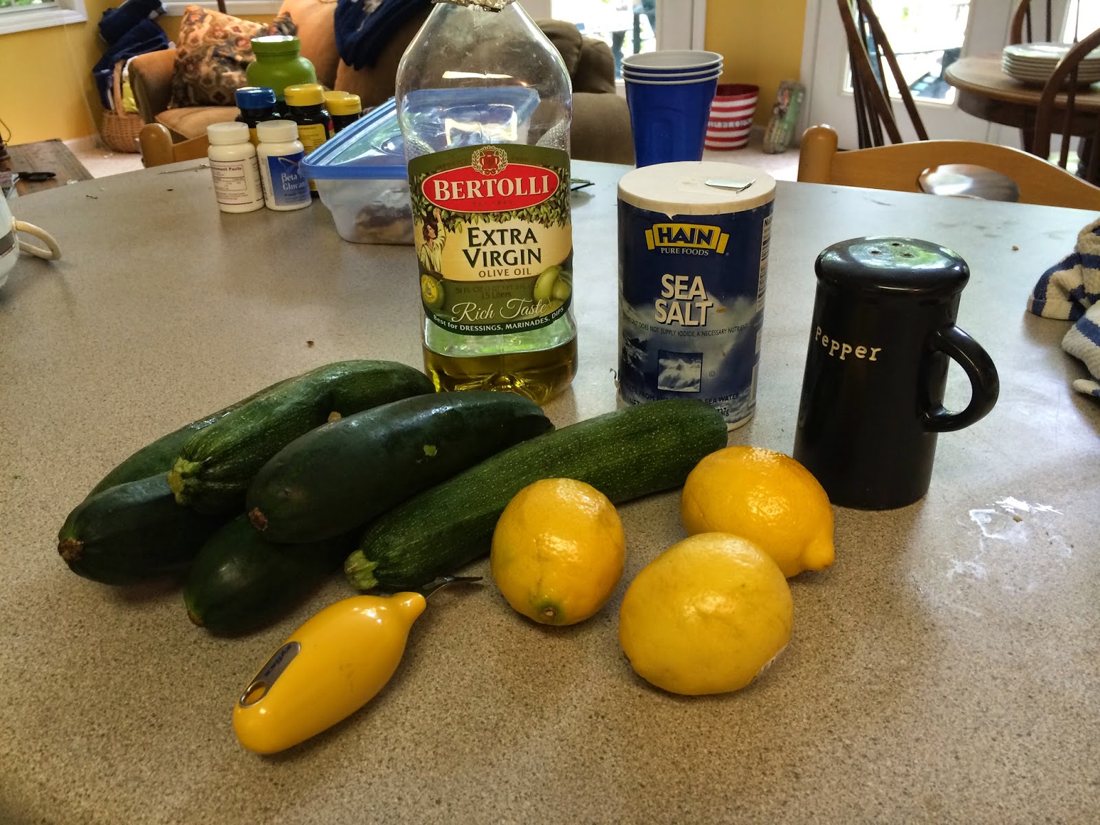 Lop off the tops and bottoms of the zucchini and slice them into quarters, lengthwise. Place them all in a very large (or two regular sized) plastic zipper bag. Drizzle in olive oil, 1 teaspoon salt, pepper, 1 tablespoon lemon zest and the juice of two lemons. Seal the bag(s) and smush them around a bit so that the zucchini is coated. Set aside for 15 to 20 minutes to marinate.