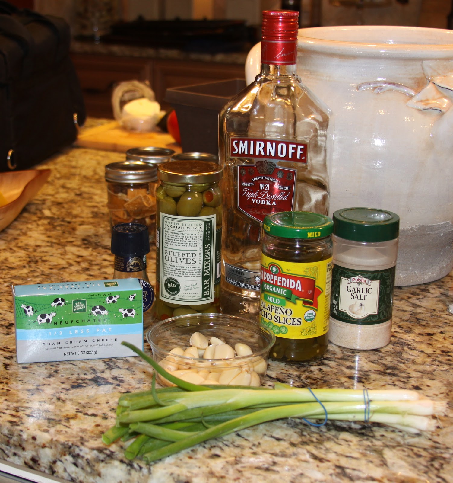 This dip should have my picture next to it, because it has everything I love in it – olives, cream cheese, garlic, jalapenos, and yes, vodka! Serve with crackers, chips or crudites.