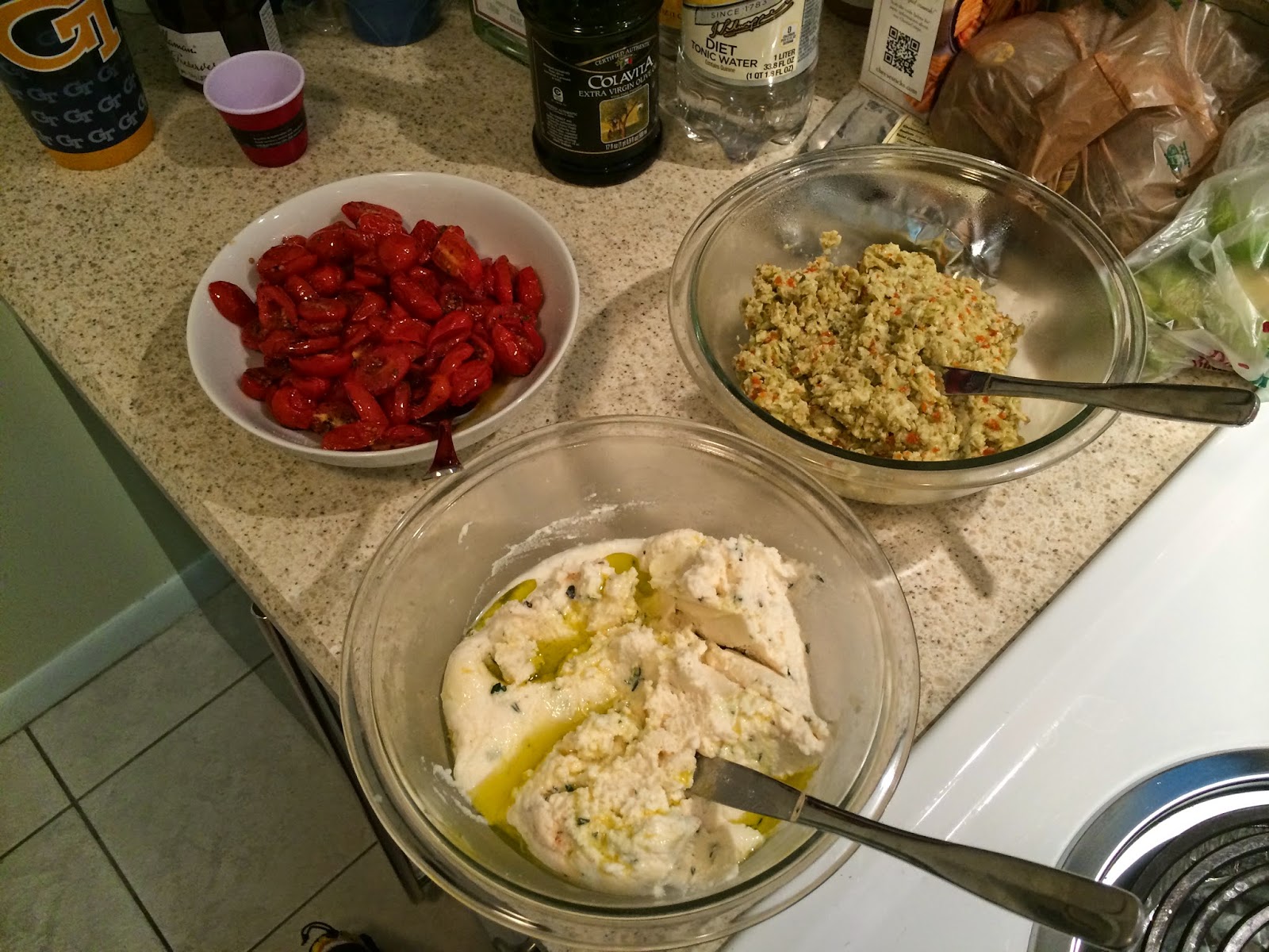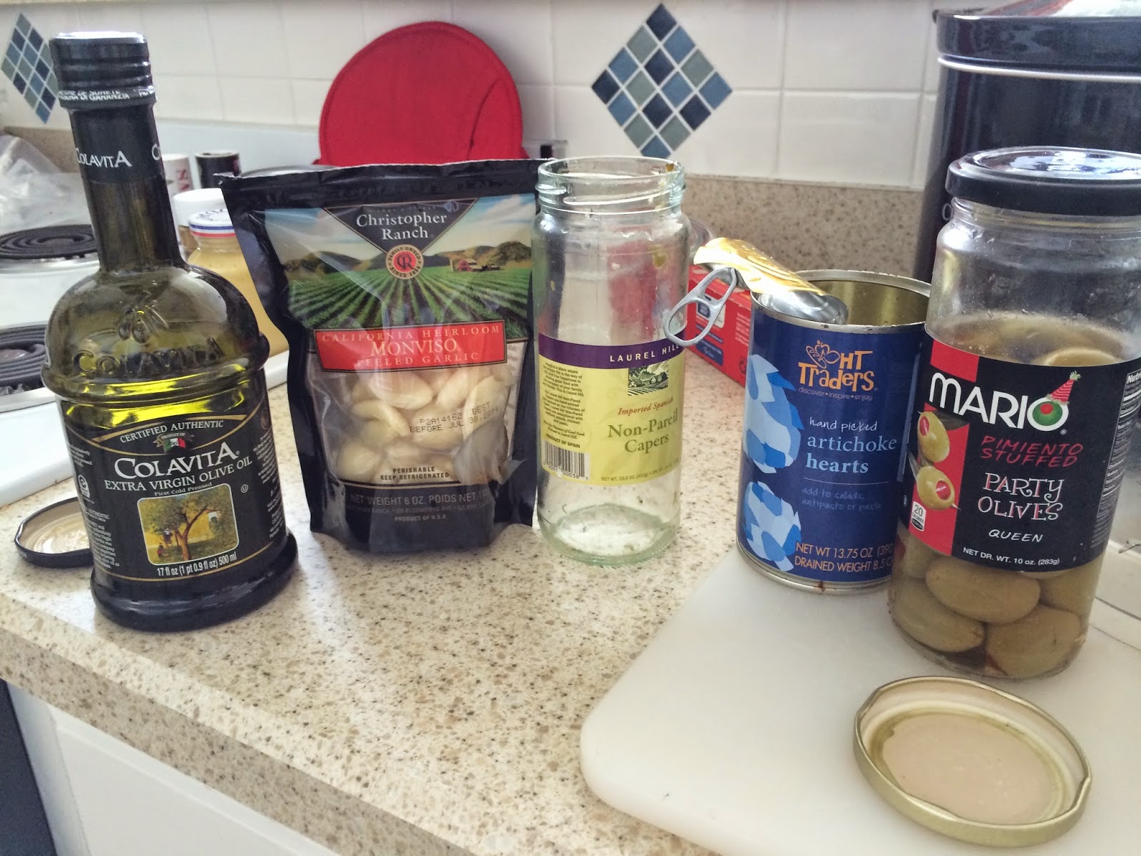 I scour other foodie blogs and found bits and pieces of this dish and put them together. It’s more amazing with fresh ricotta, but if you buy good organic ricotta, it’s still pretty darn amazing. The flavors of all the dishes combine beautifully and can be prepared in advance. Ricotta, roasted tomatoes, olives, artichokes and crostini = LOVE!