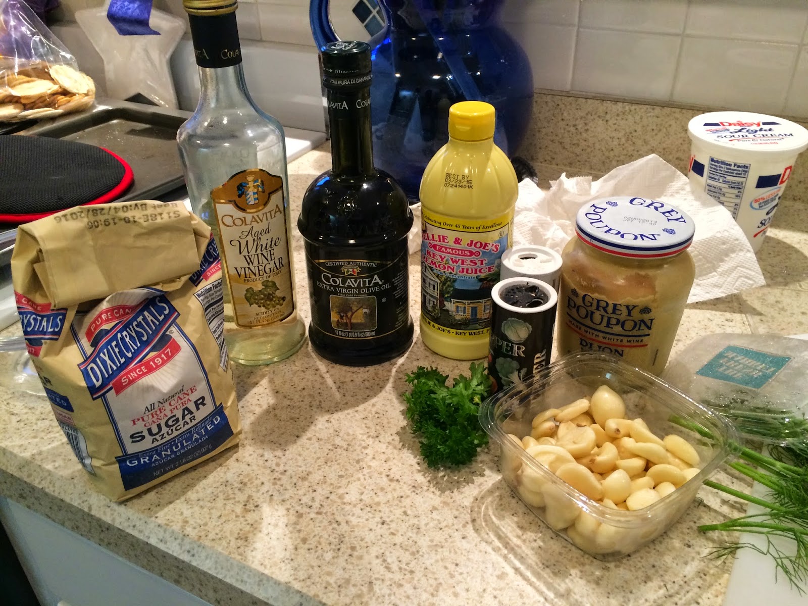 In a large bowl, whisk together the olive oil, white wine vinegar, mustard, salt, pepper, sugar, parsley, lemon juice and garlic.
