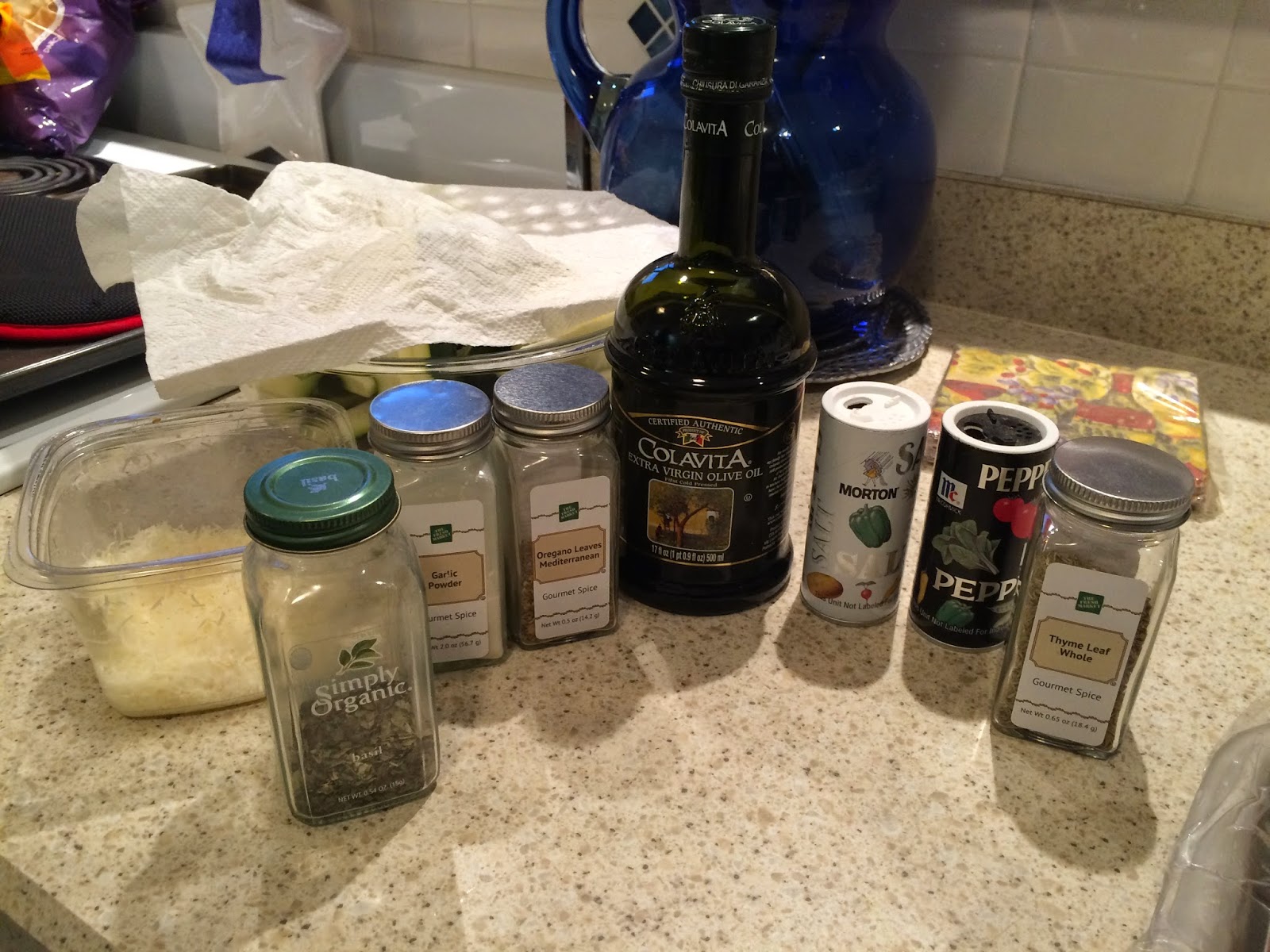 Preheat oven to 350 degrees F. Coat a cooling rack with nonstick spray and place on a baking sheet; set aside. In a small bowl, combine Parmesan, thyme, oregano, basil, garlic powder, salt and pepper, to taste.