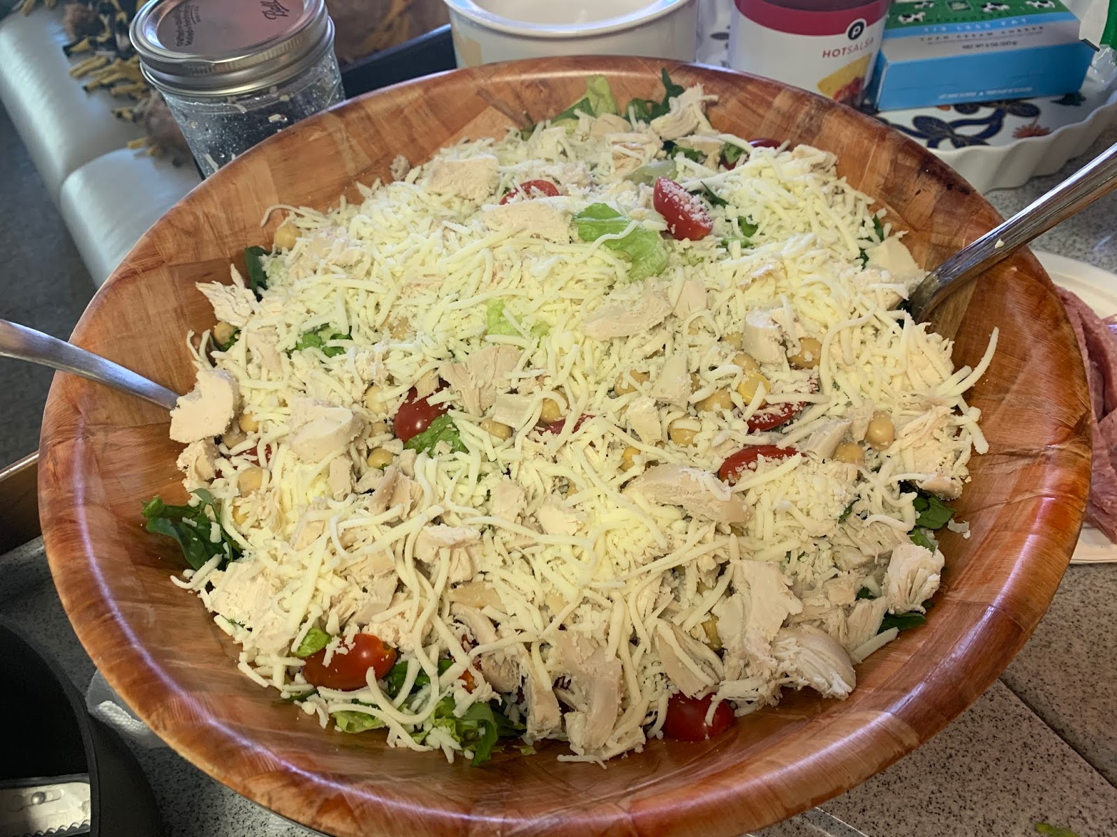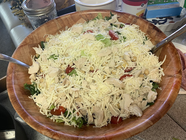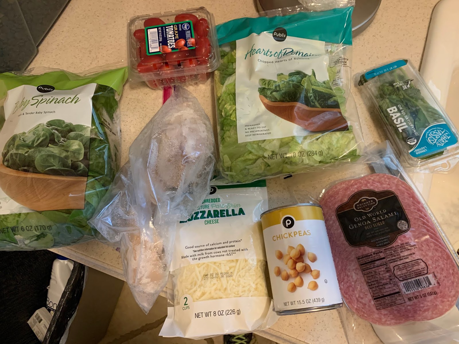 In a large bowl mix the greens together. Top with chickpeas, salami, chopped chicken, cheese, tomatoes, and basil.