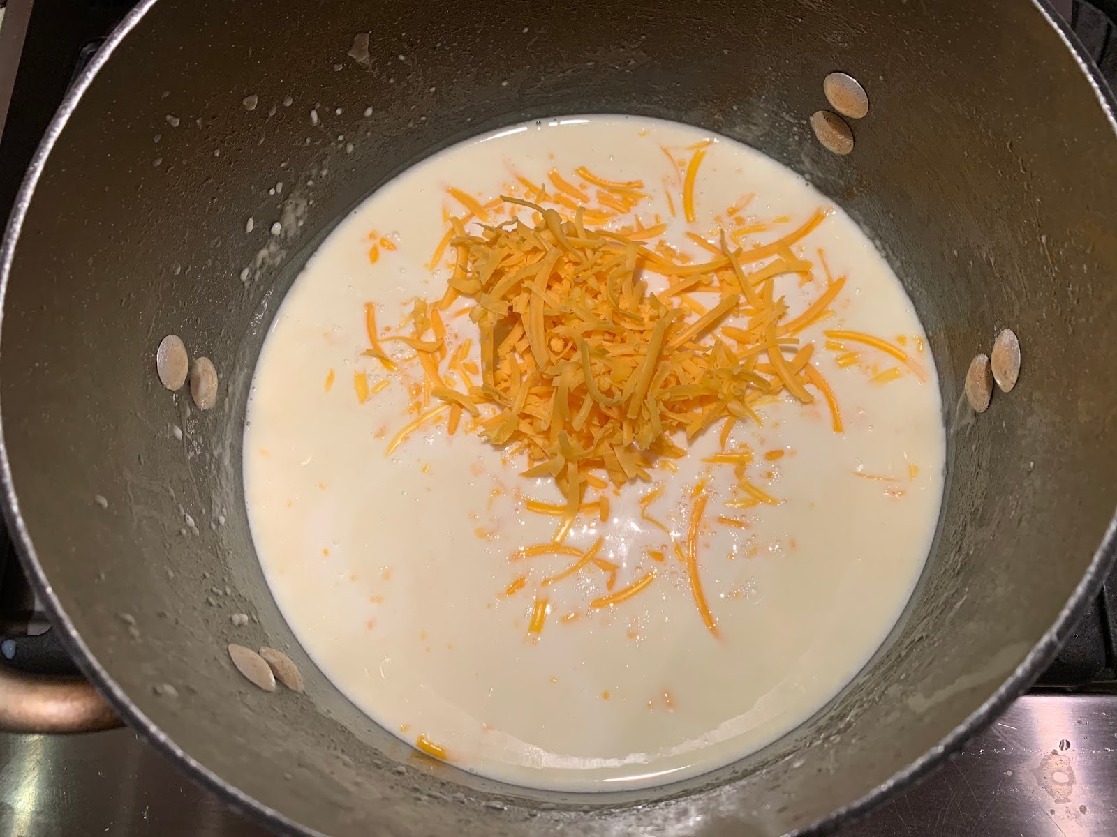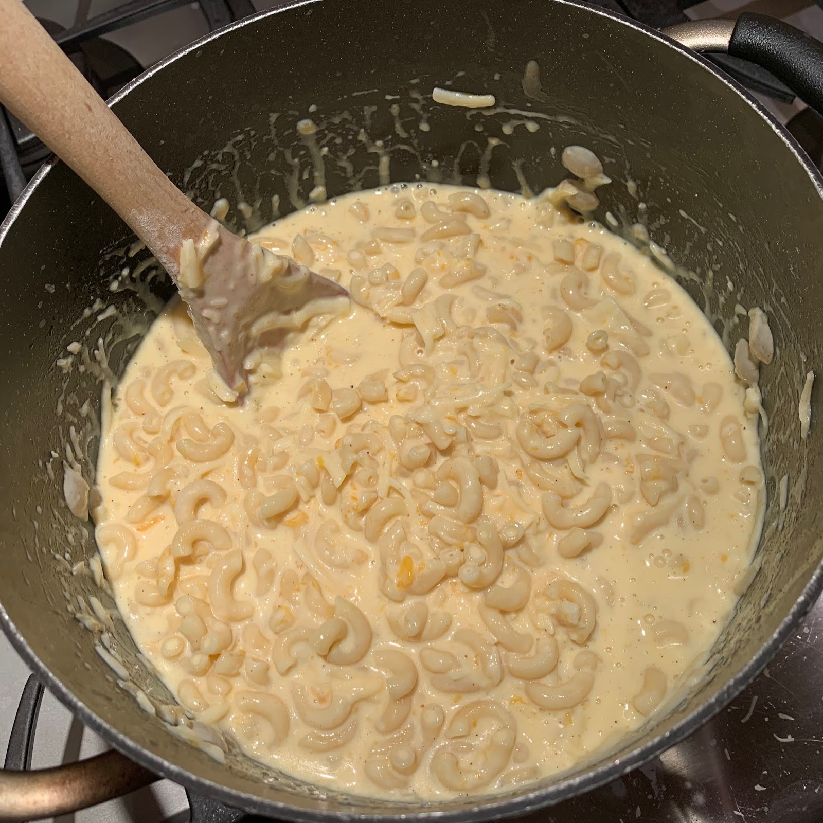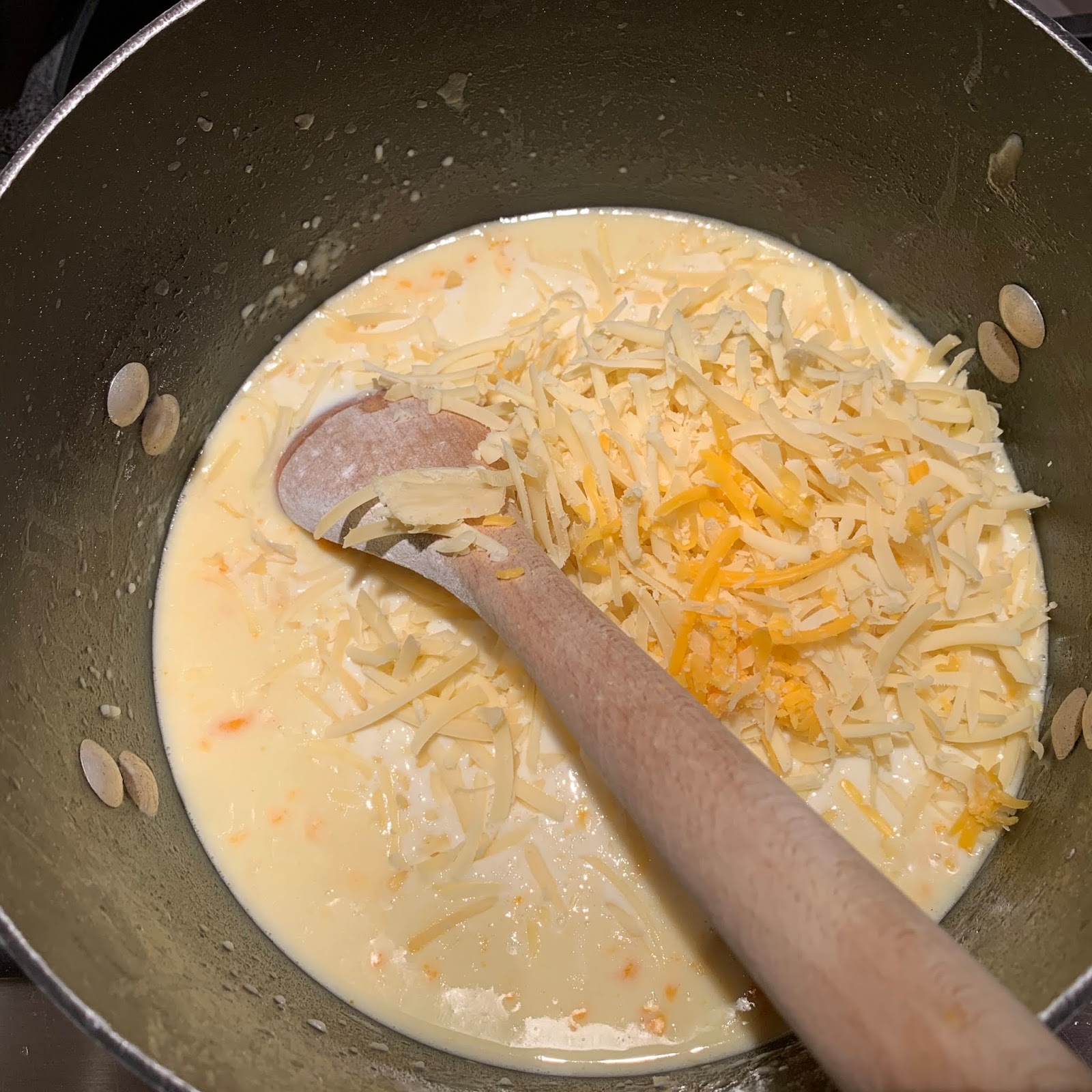 Off the heat, add the Gruyere, cheddar, 1 tablespoon salt, pepper, and nutmeg.