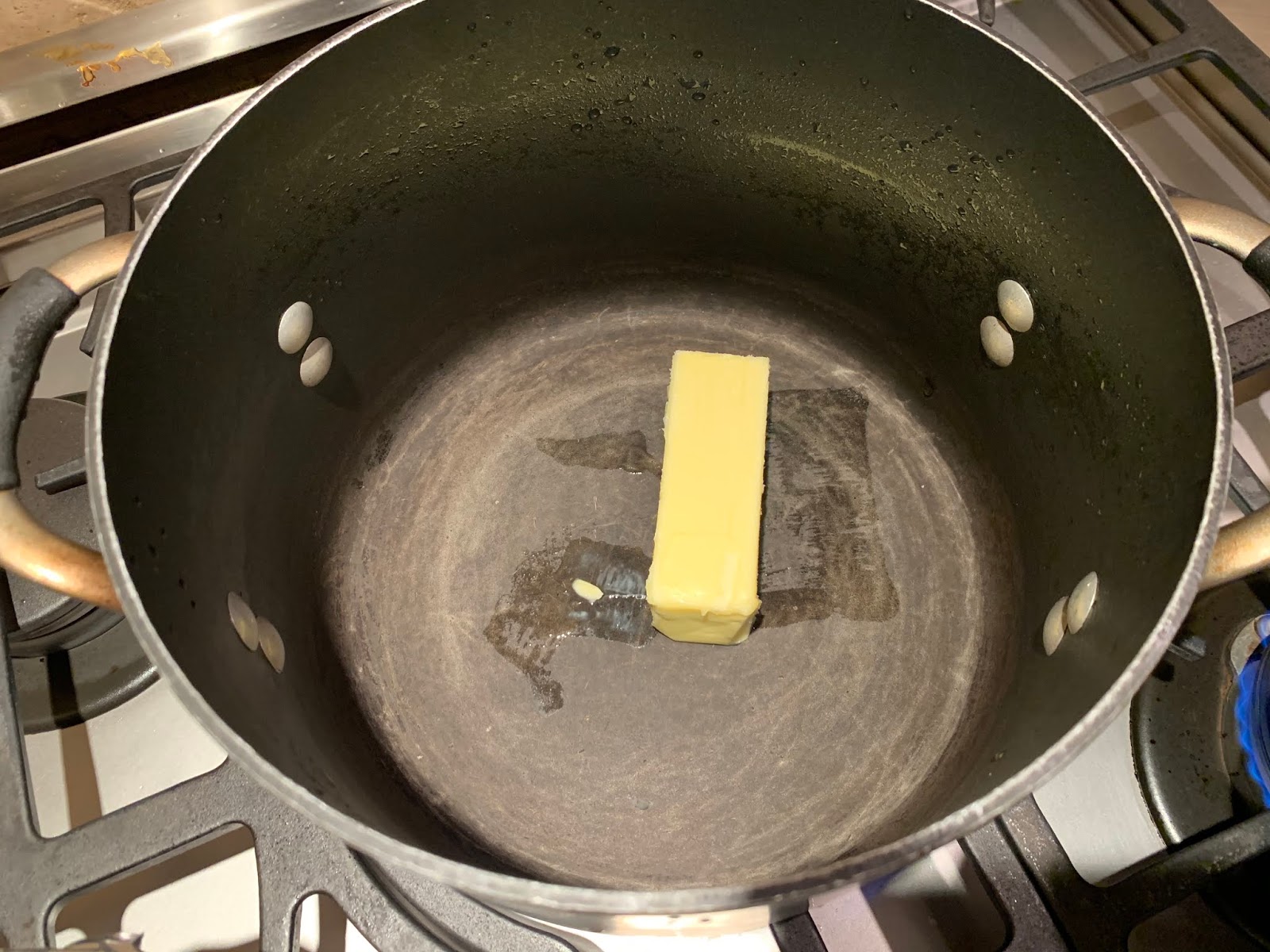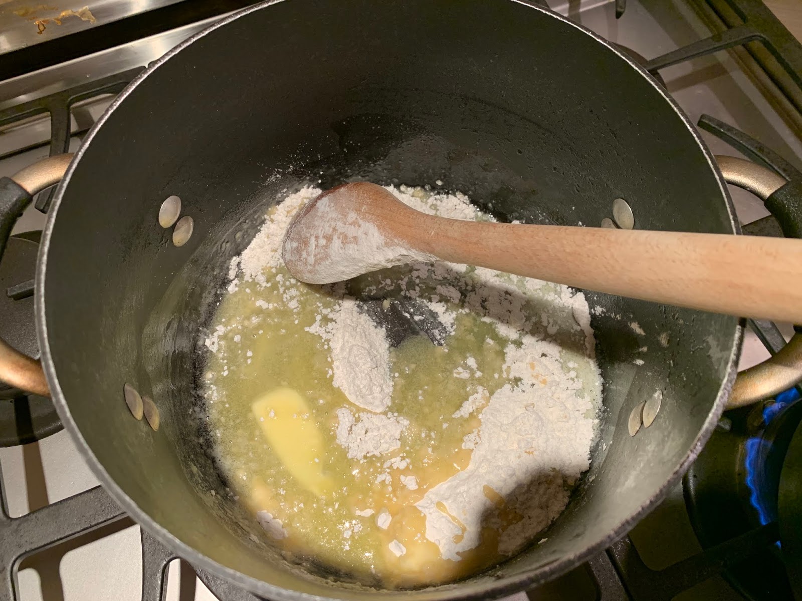 Melt 6 tablespoons of butter in a large (4-quart) pot and add the flour.