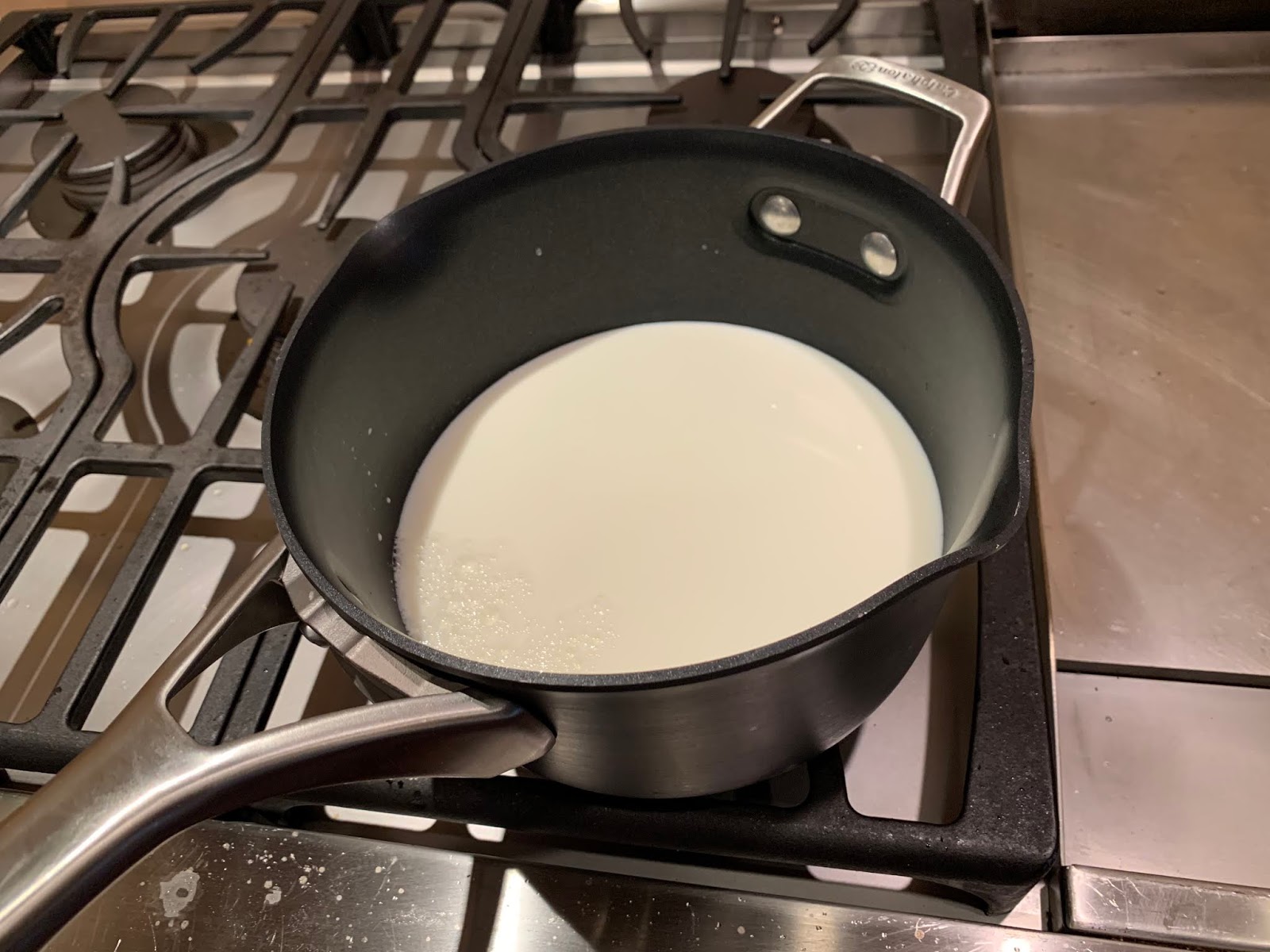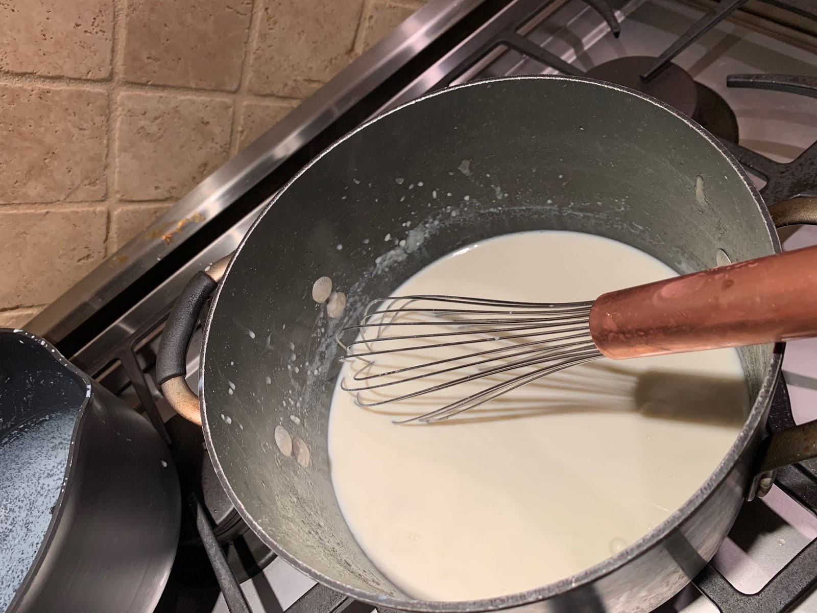 Cook over low heat for 2 minutes, stirring with a whisk. While whisking, add the hot milk and cook for a minute or two more, until thickened and smooth.