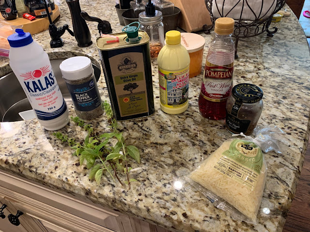 In a small bowl whisk together olive oil, red wine vinegar, lemon juice, mustard, basil, and parmesan cheese. Add S and P to taste.