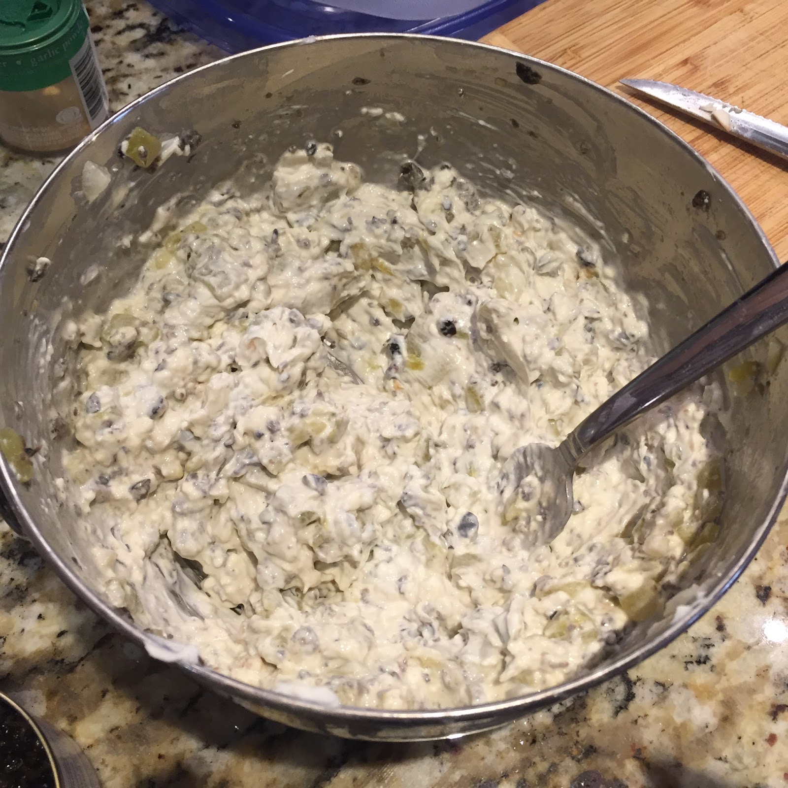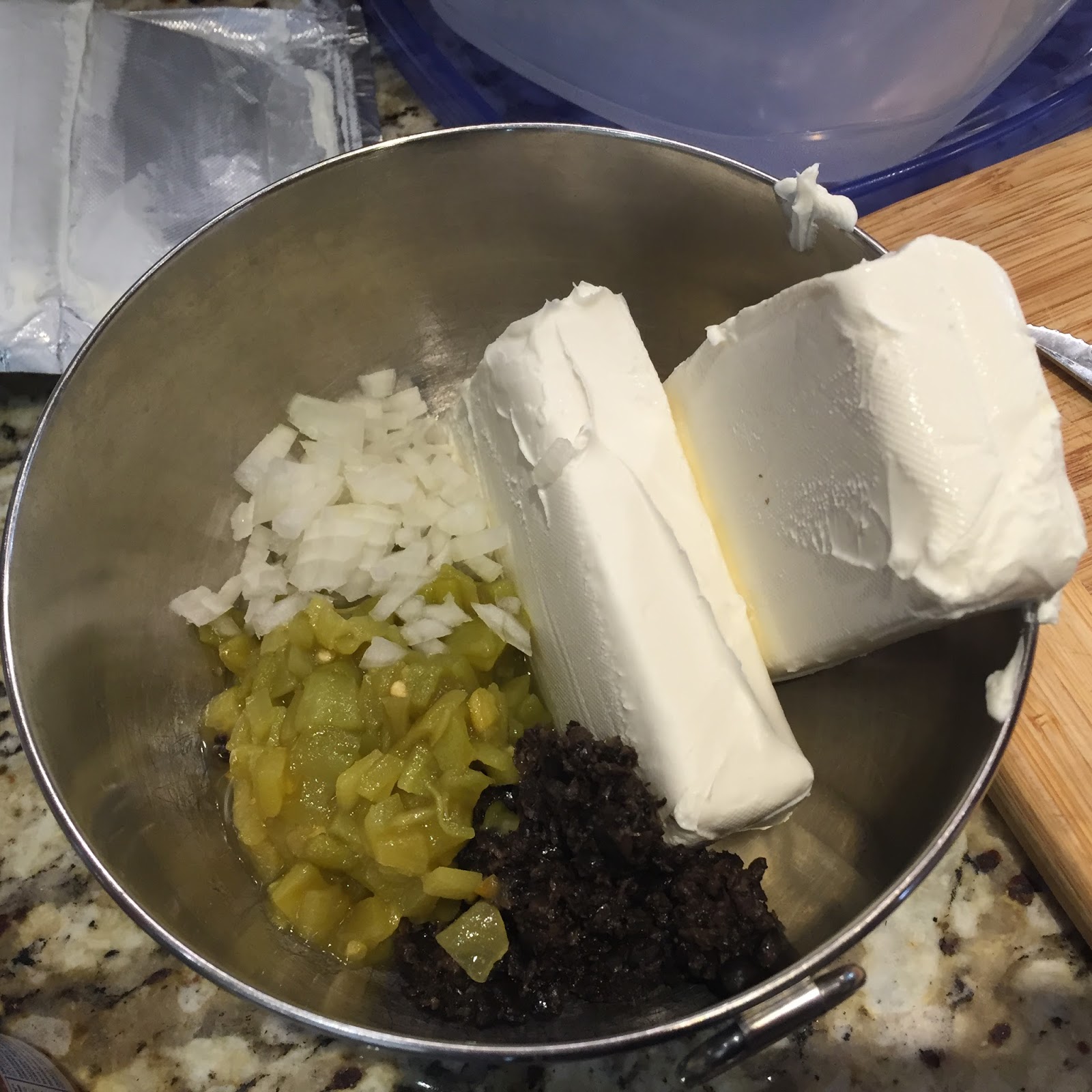 Combine the olives, softened cream cheese, onion and green chiles.