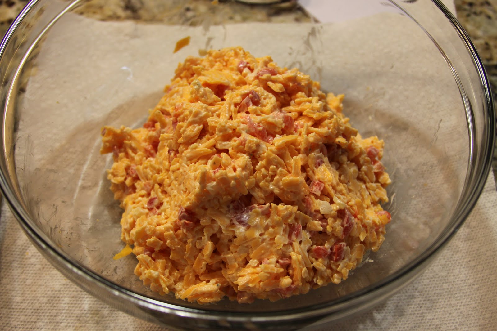 Stir in mayo, mustard, pimentos and cayenne. Add salt and pepper.