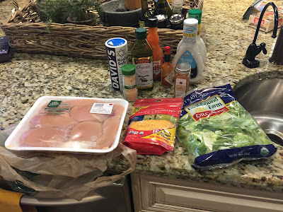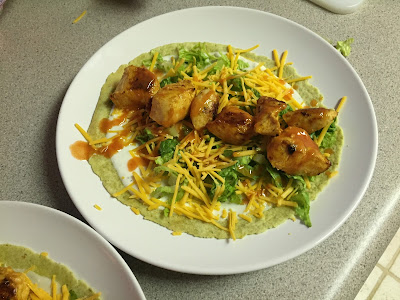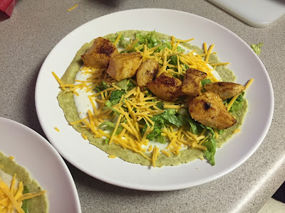 Use tongs to arrange chicken pieces in the hot skillet, and toss out the marinade. Cook approximately 5 minutes per side, until chicken is cooked through. Chop chicken into smaller pieces if needed. Arrange cooked chicken pieces down the center of each tortilla.