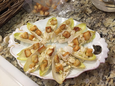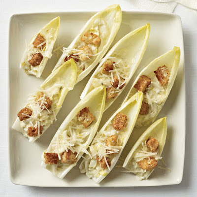 Trim the endives and remove the largest leaves from all but one of the heads. Stack the leaves and trim them to about 4 inches. Thinly slice the remaining 1 endive, along with the trimmings of the 6 other heads (you should have about 3 cups), and toss with the dressing.