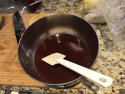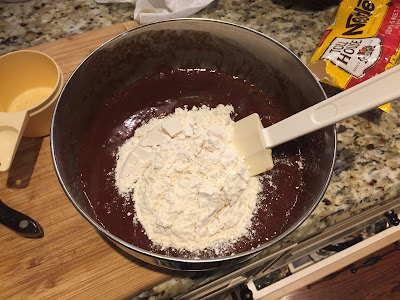 In a large pan over low heat, melt butter and semisweet chocolate, stirring often.
