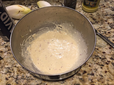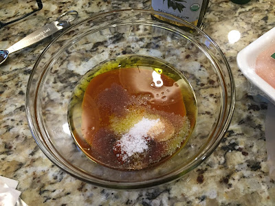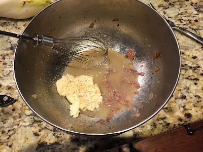 Then whisk in the remaining 2 TBSP of olive oil, and season with salt and pepper. Stir in the 1/4 cup of grated cheese.