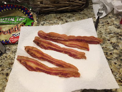 Cook bacon in a skillet (or microwave for ~ 4 minutes) over medium heat, turning, until crisp, about 12 minutes. Drain on paper towels. When cool, crumble bacon.
