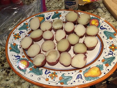 Trim a small slice from the bottom of each half so it stands upright. With a melon baller or teaspoon, remove center of each potato, leaving a 1/4-inch border.