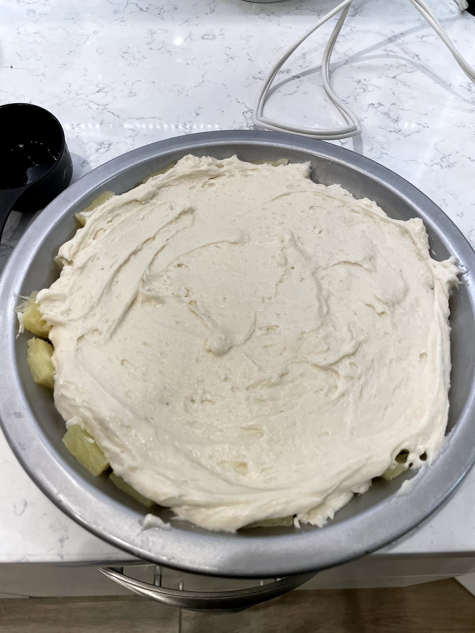Remove topping from the refrigerator. Pour and spread cake batter evenly over topping.