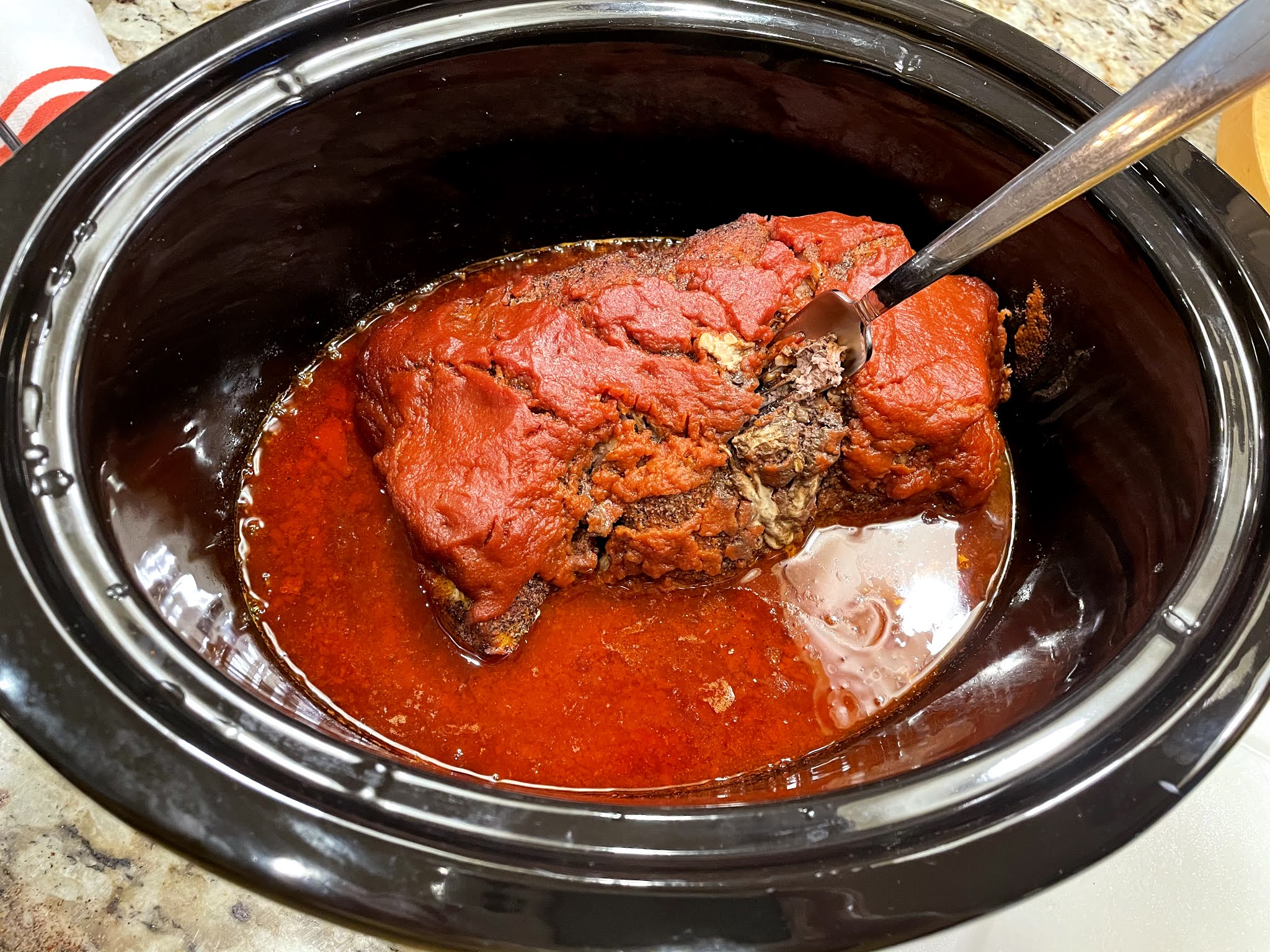 Remove from slow cooker and let cool slightly. Then shred using two forks.