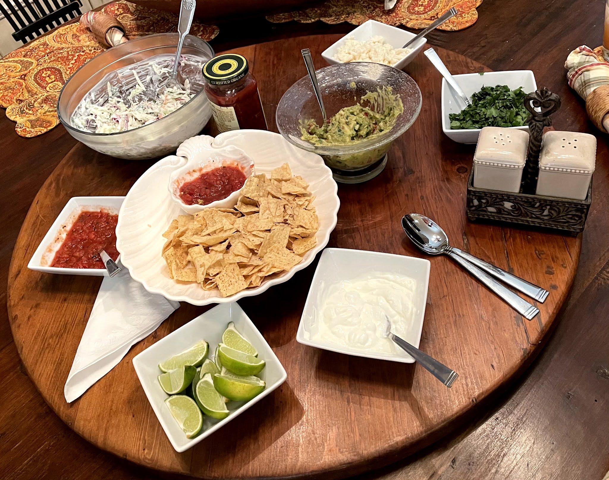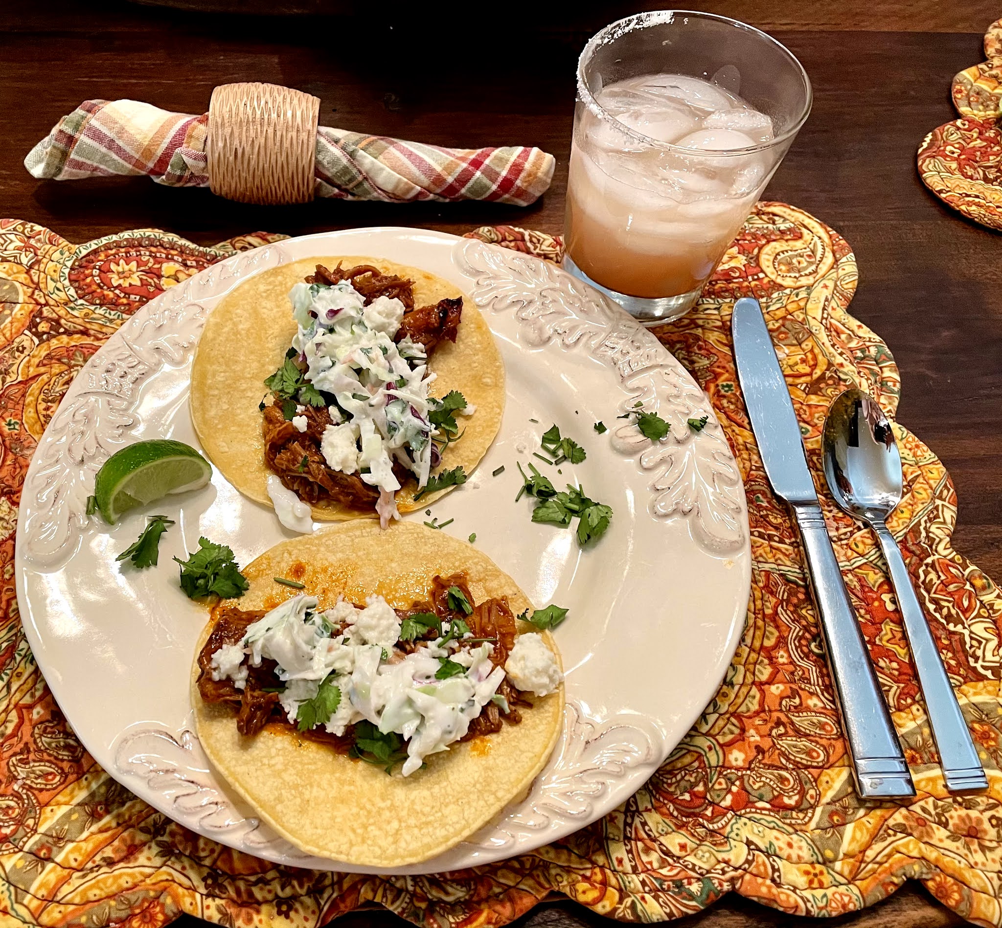 I first saw this recipe and wondered about the combination? You’ve got slow cooked barbecue pulled pork combined with coleslaw, cilantro topped with guacamole and queso fresco. Would it work? The answer: it does indeed work! The sweetness of the barbecue sauce is offset nicely with the tangy slaw and limey guac. Then that queso fresco adds yet another dimension. This dish will be on my rotation – perfect for a weeknight meal OR tailgating. Top it off with a Paloma (recipe below) or margarita and you have an incredible dinner!