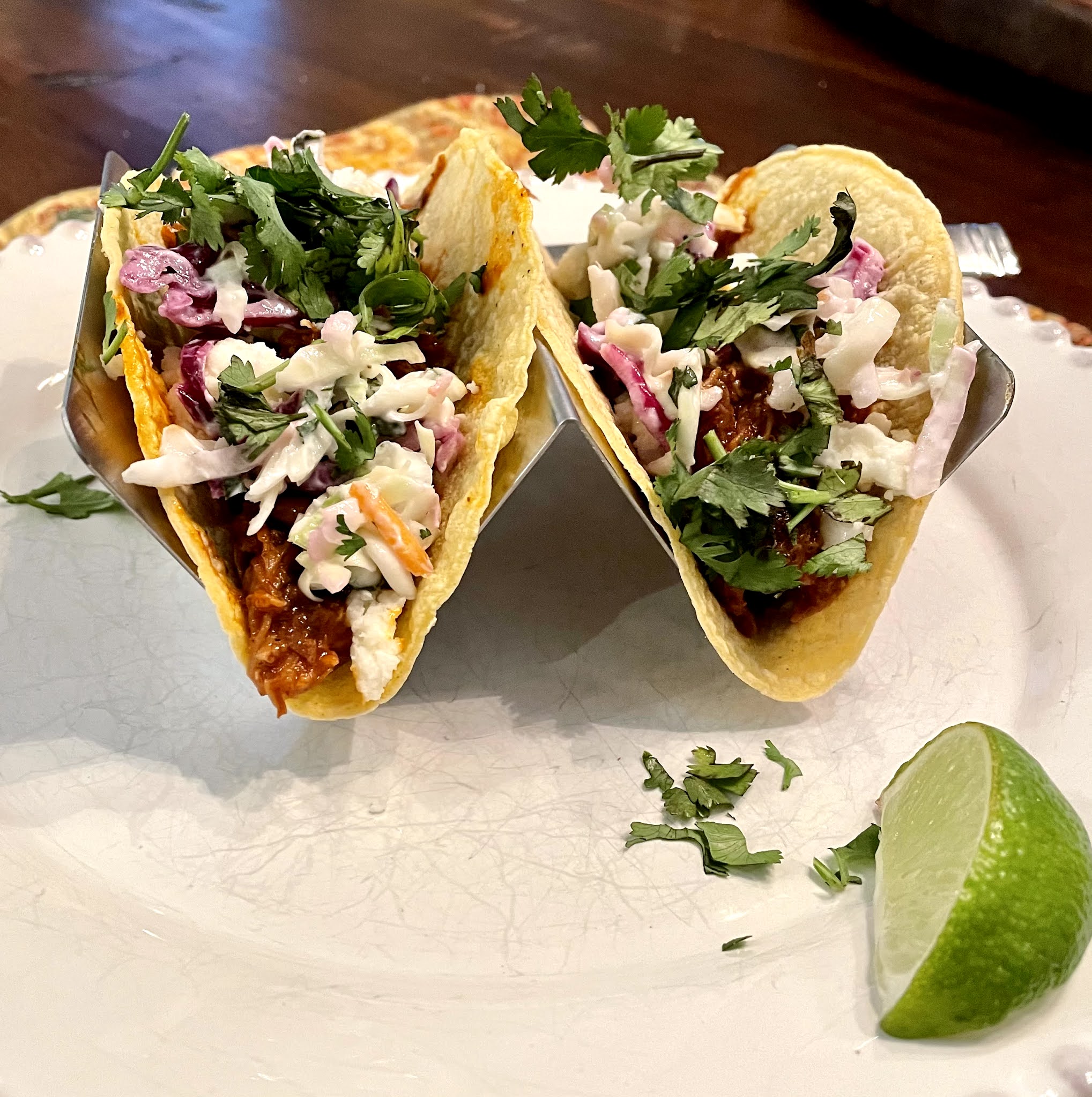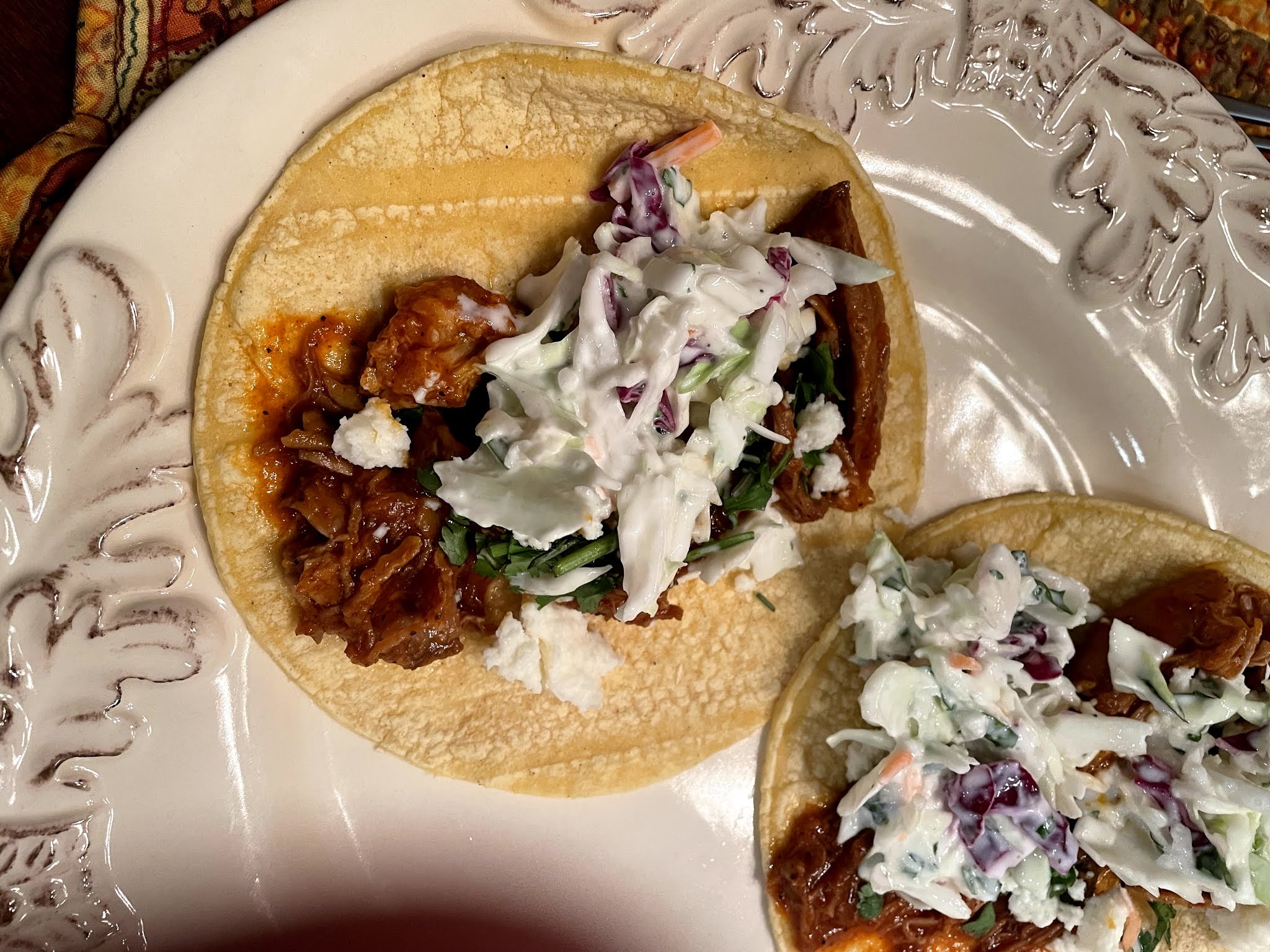 PULLED PORK TACOS with COLE SLAW AND GUACAMOLE