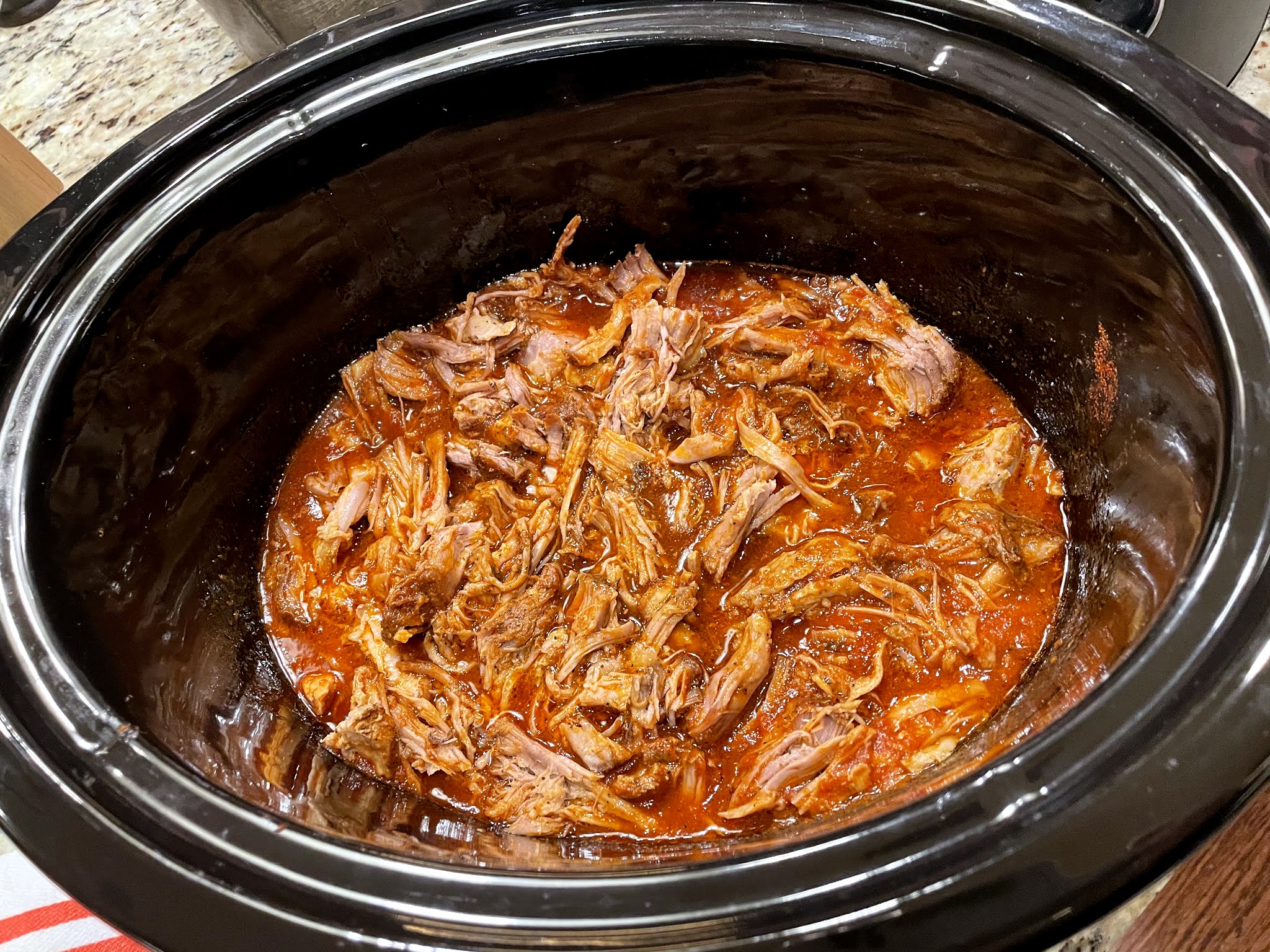Cook on low for 10 hours or on high for 6 hours. Once fully cooked, pork should be tender enough to shred.