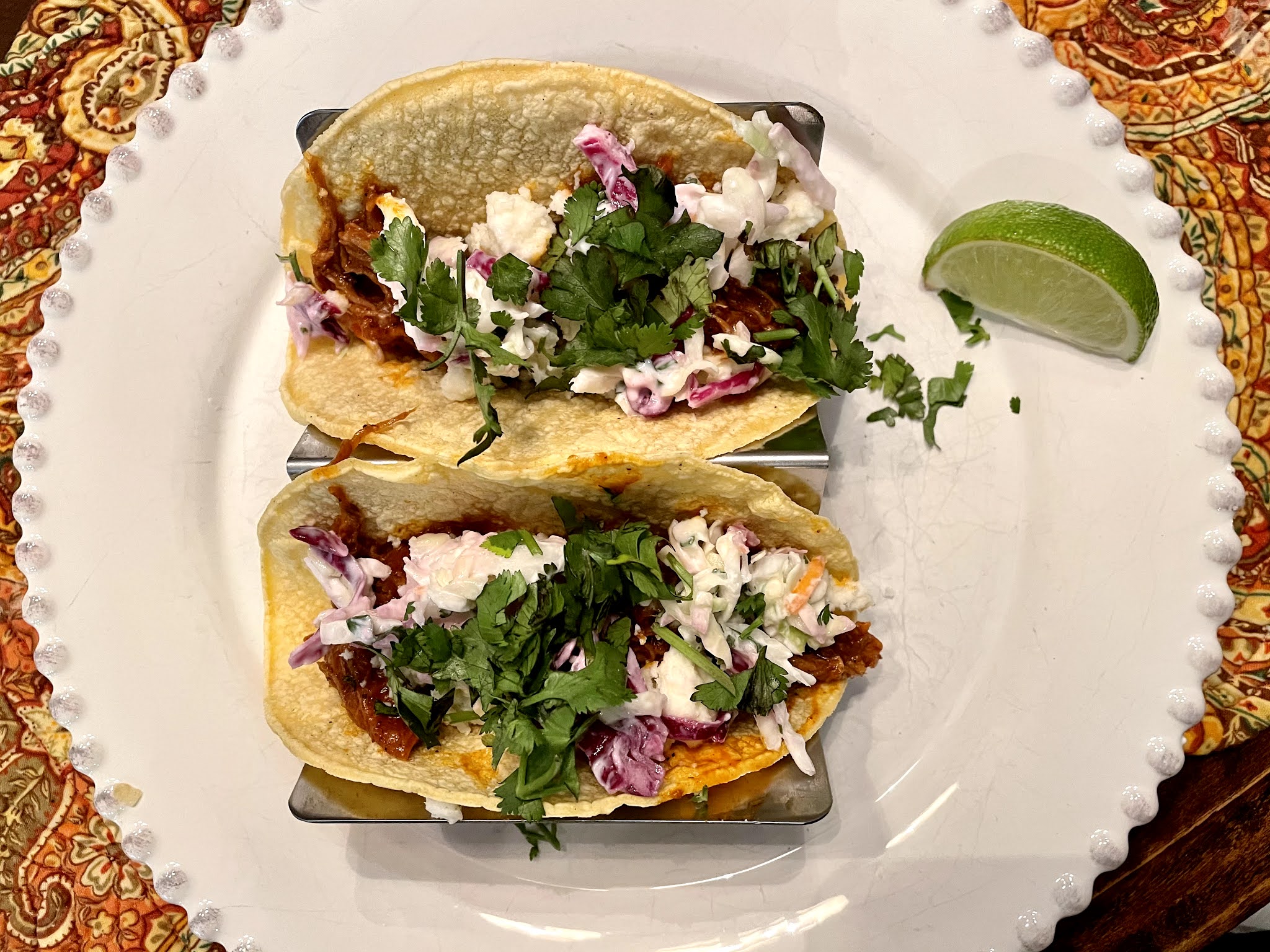 Assemble tacos with pulled pork, slaw, guacamole and queso fresco and serve with lime wedges on the side.