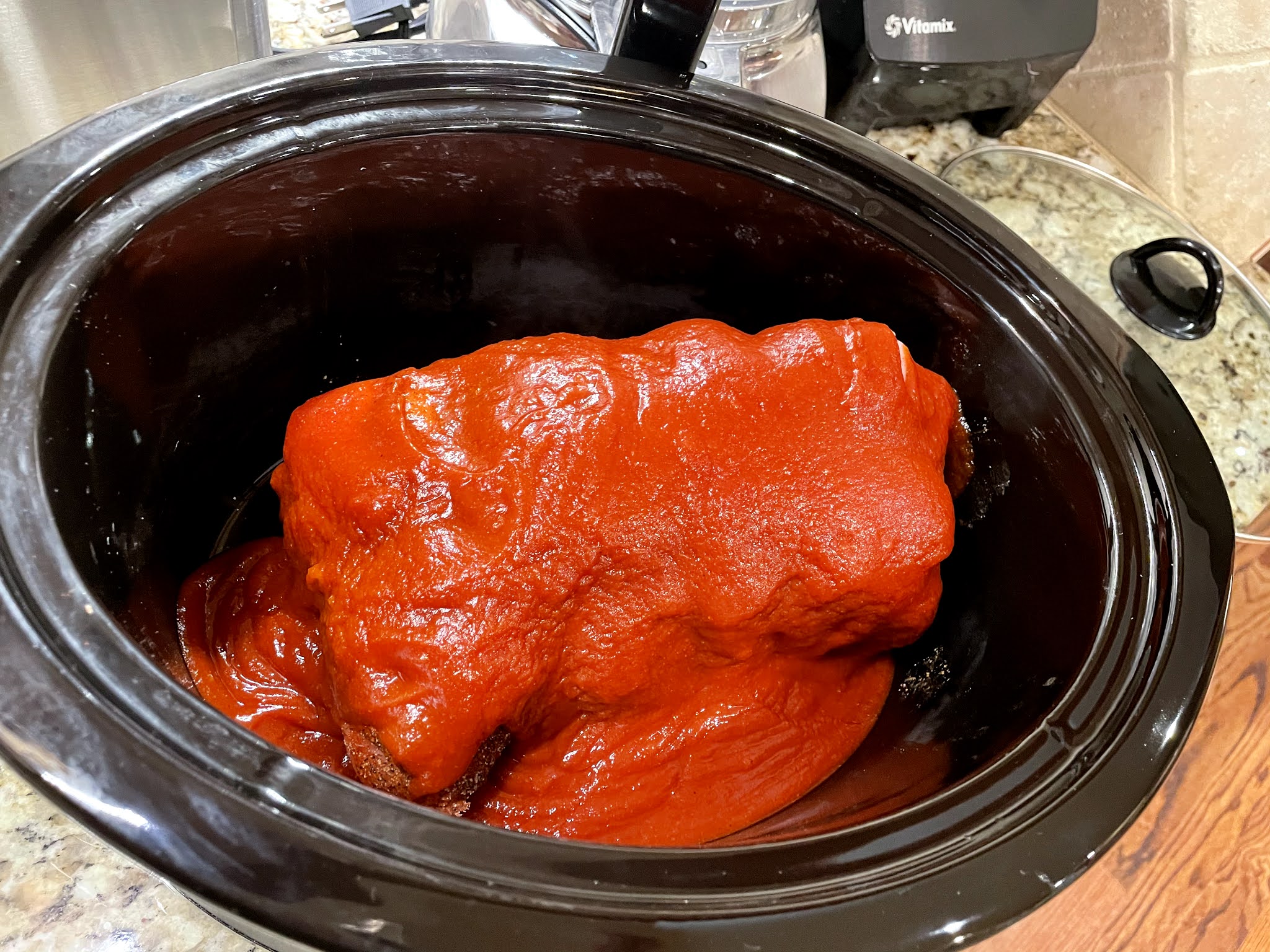 Place the pork in a slow cooker, and add the barbecue sauce.