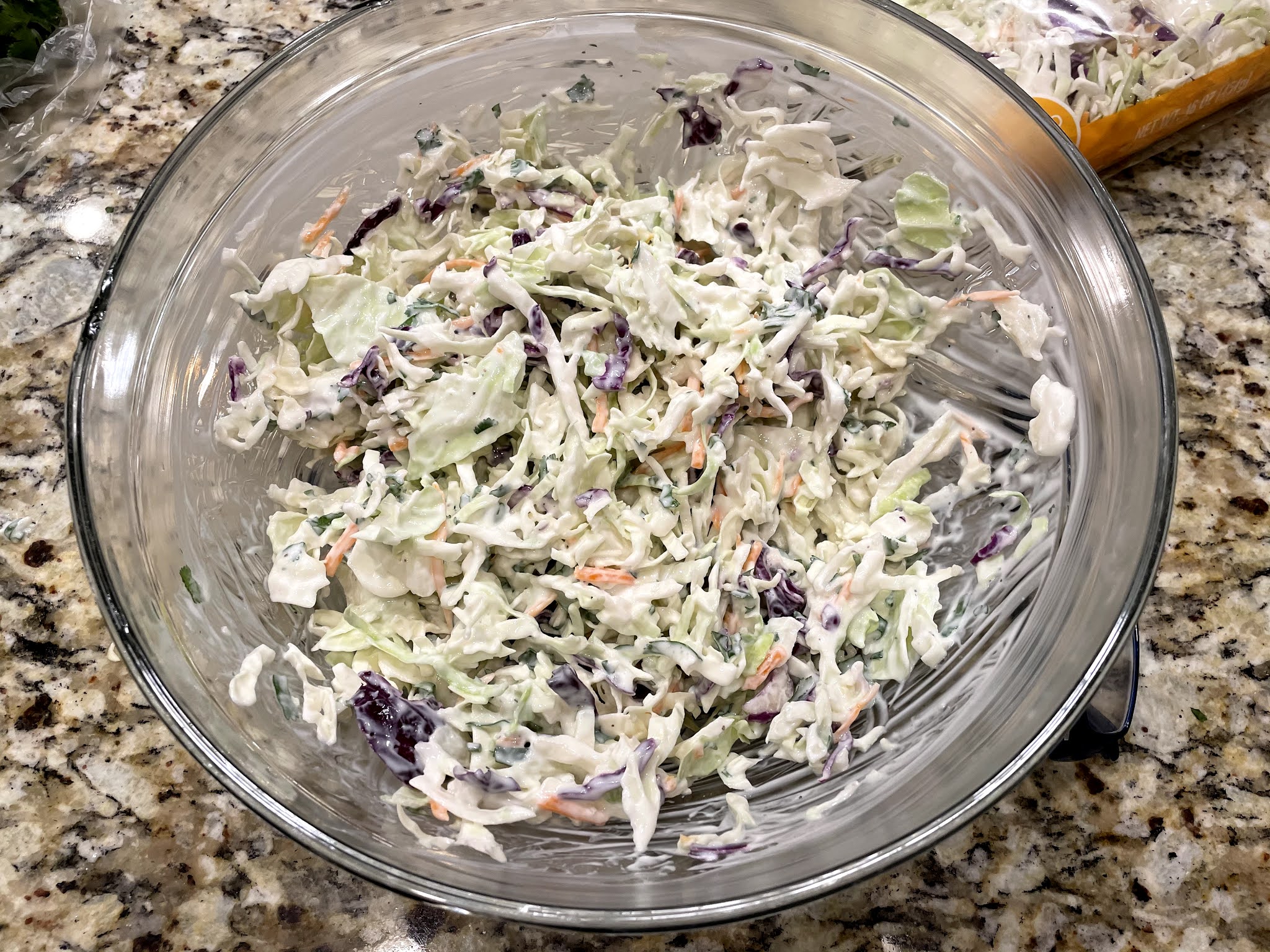 Add all the ingredients (except the shredded cabbage) to a large mixing bowl and mix together until combined.