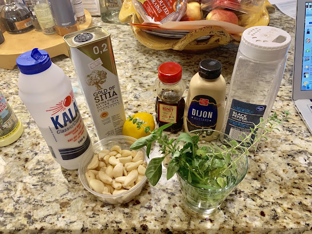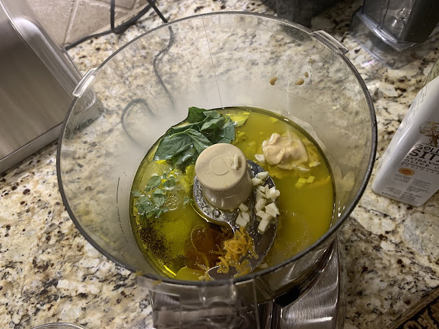 Place lemon juice, zest, olive oil, mustard, honey, garlic, basil, oregano, salt, and pepper in a food processor.