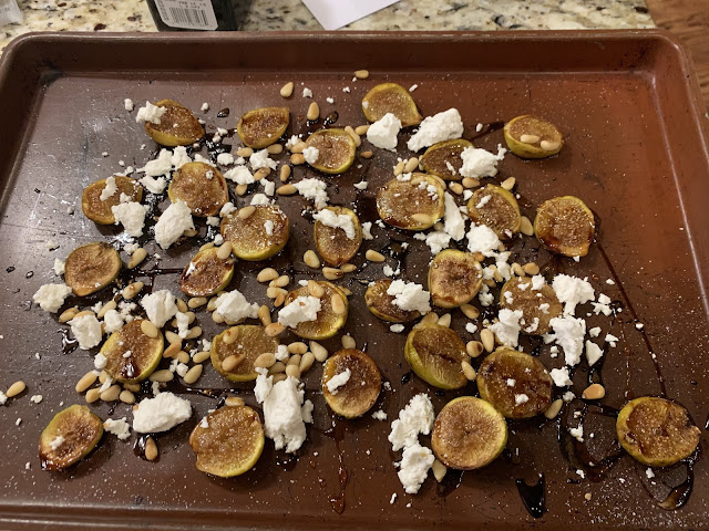 10-12 fresh figs1-2 TBSP balsamic vinegarSalt1/4 cup pine nuts2-3 TBSP crumbled goat cheese