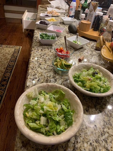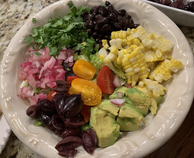 Cook the corn (I microwaved it for ~3 minutes). Cool and then cut off the cob. I then placed all the ingredients in bowls so each person could make their own salad.