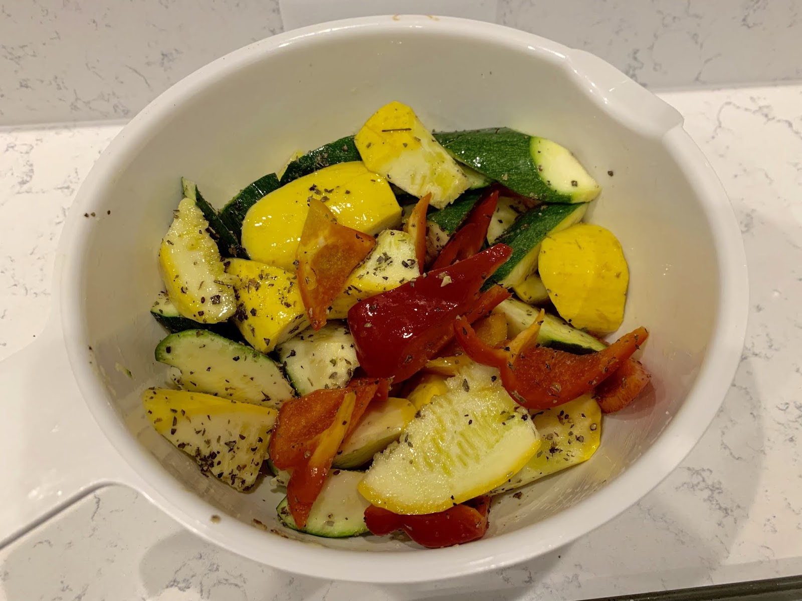 Preheat oven to 425 degrees F. Place squash, zucchini and red bell pepper and garlic and about 1-2 TBSP oil in a large bowl. Toss until the veggies are coated. Add the oregano and basil and liberally sprinkle on salt and pepper and toss once more.