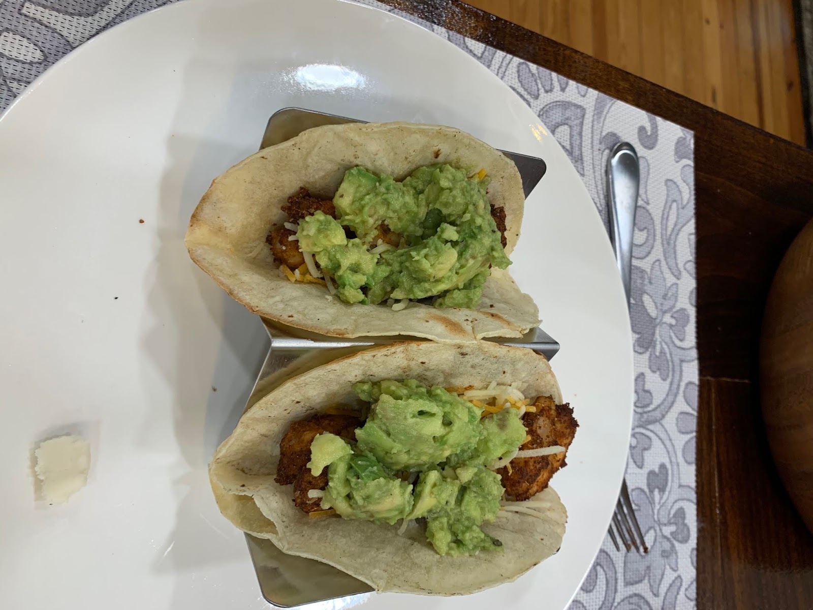 Assemble the tacos with the cooked shrimp and slaw, and serve chopped avocados, shredded cheese, additional chopped cilantro, some salsa and lime wedges on the side.