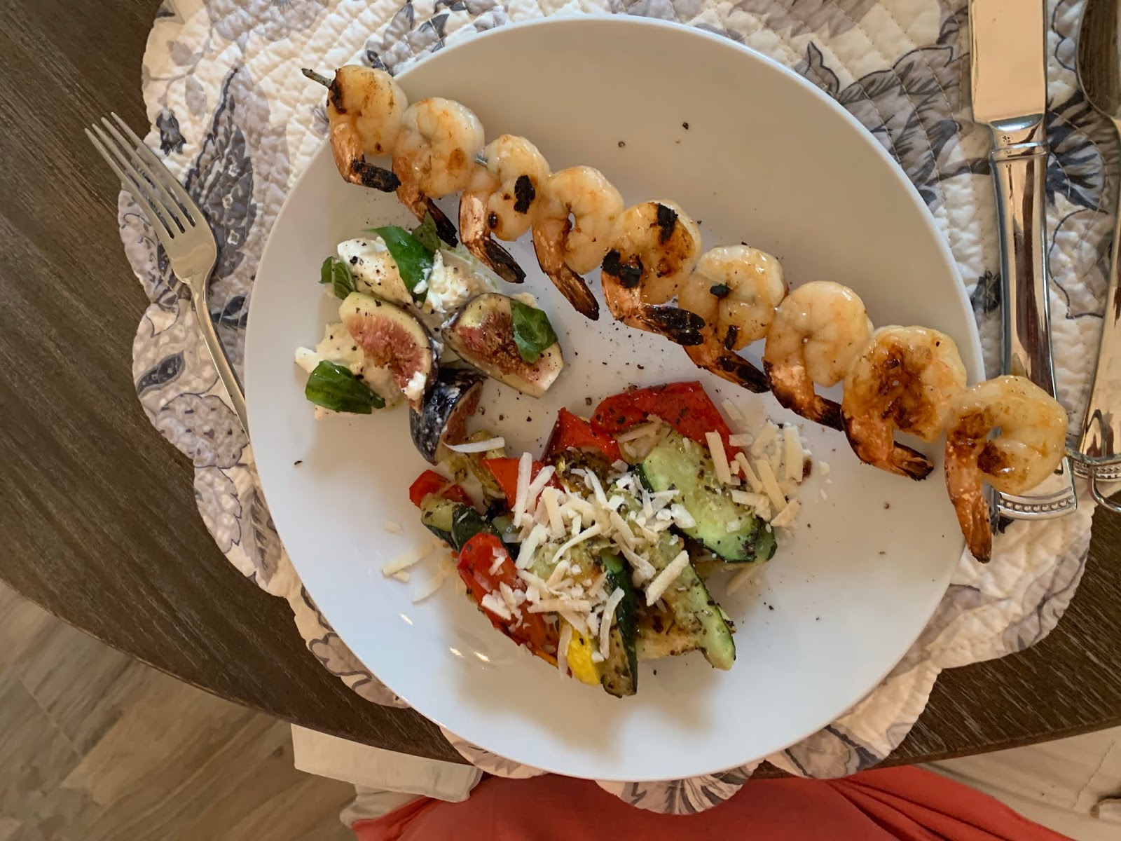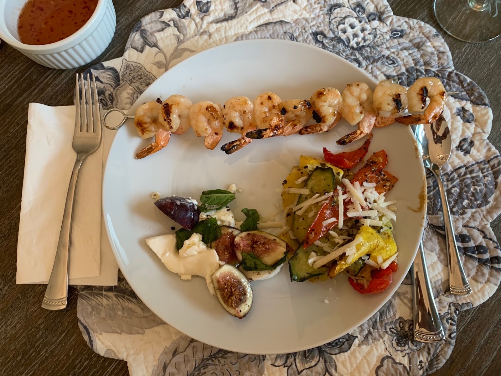 And second, another grilled shrimp but with a Thai flavor. Tangy, sweet and spicy – served with roasted veggies and my new favorite dish: fig caprese salad. You’ve then got yourself a most delicious and nutritious dinner.